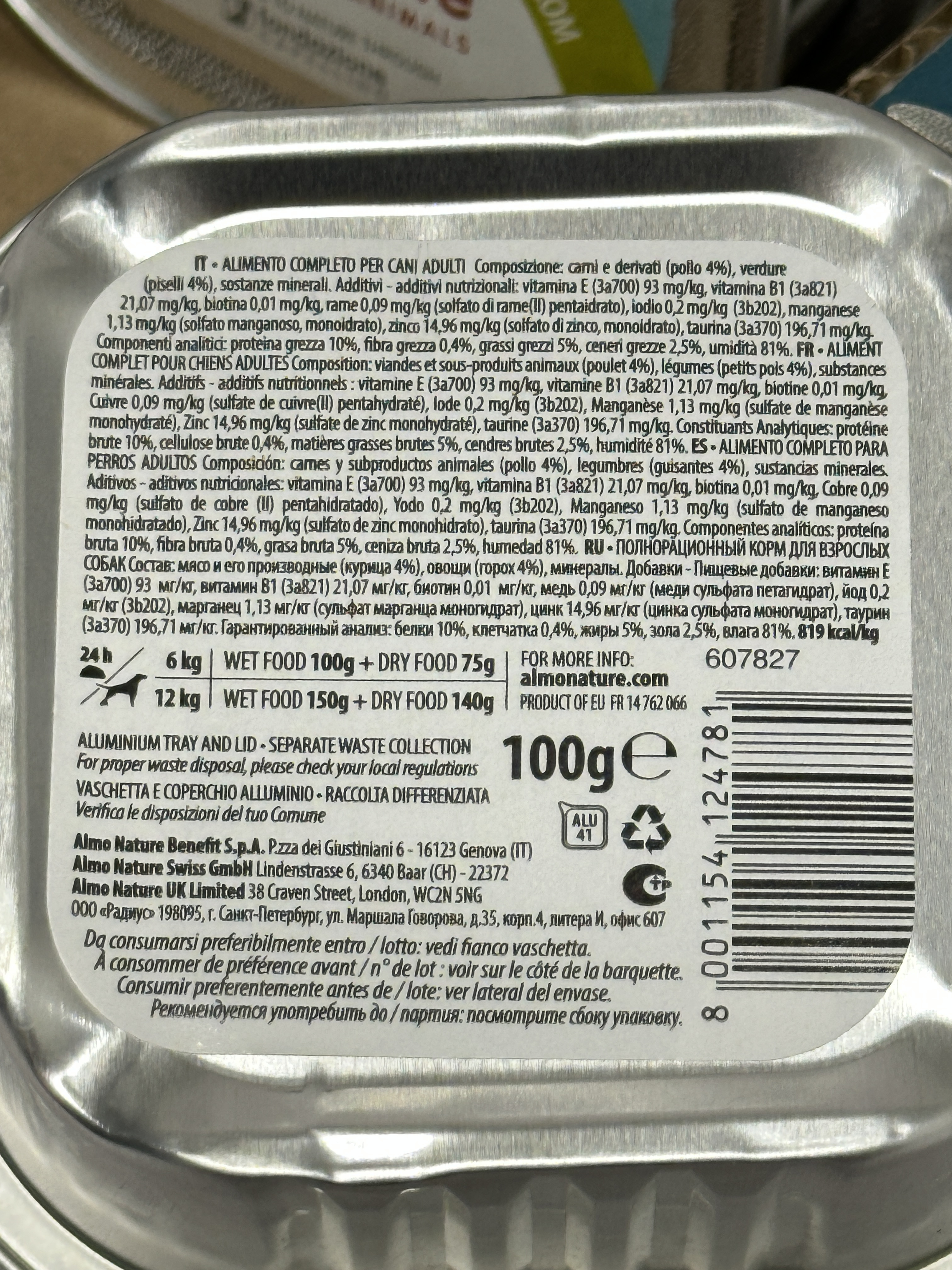 Composition: Meat and animal derivatives (chicken 4%), vegetables (peas 4%), vegetable protein extracts, minerals.