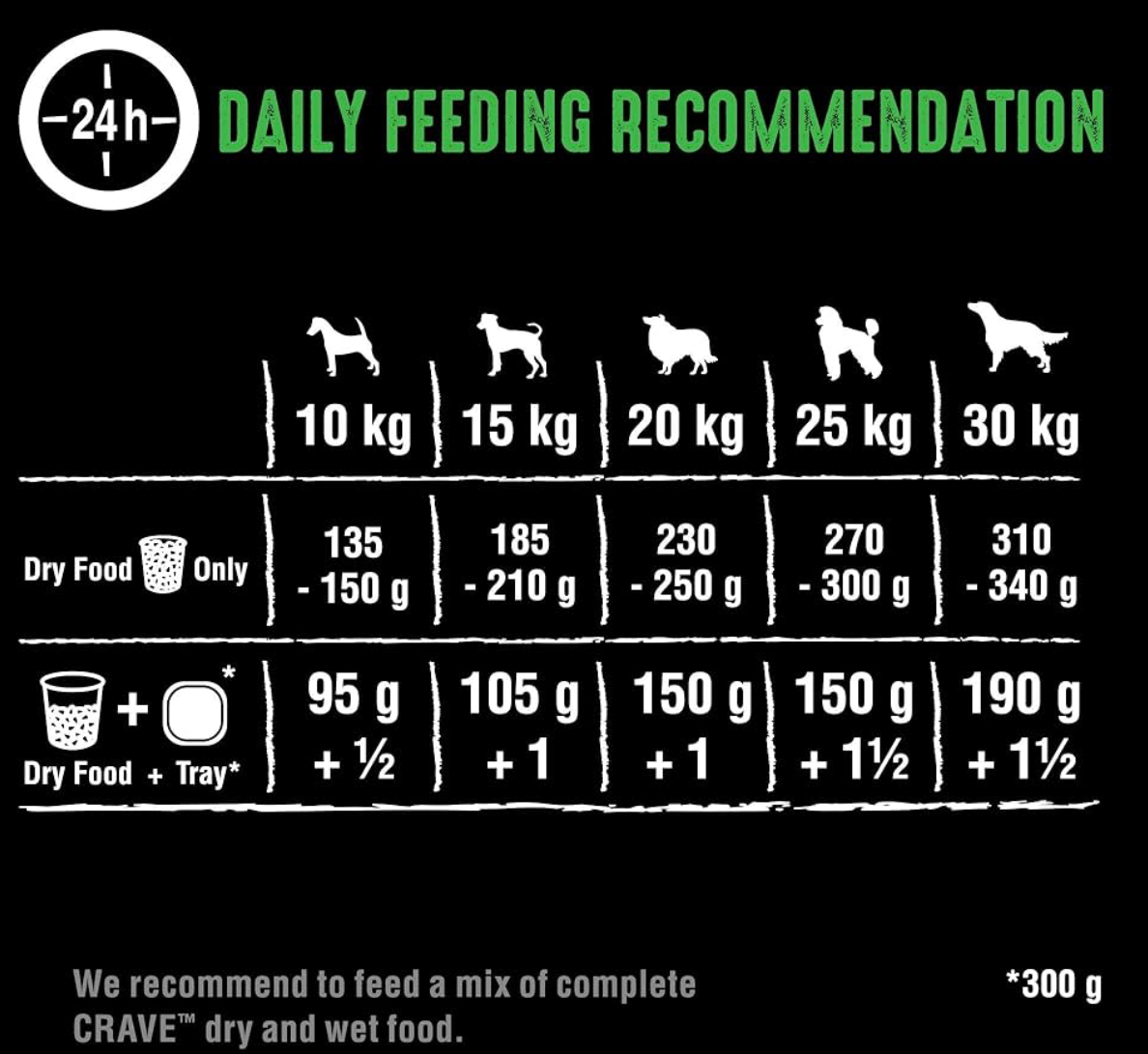 - 25kg dog: 270–300g