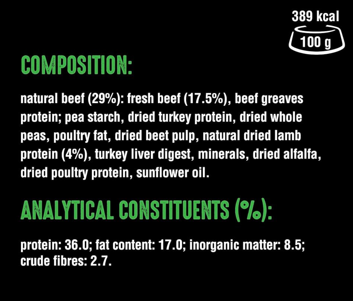 Beef (29%: fresh beef 17.5%), beef greaves protein, pea starch, dried turkey protein, dried peas, poultry fat, dried beet pulp, lamb protein (4%), turkey liver digest, dried alfalfa, dried poultry protein, sunflower oil, minerals.