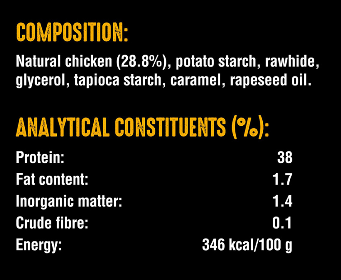 Composition: Natural chicken (28.8%), potato starch, rawhide, glycerol, tapioca starch, caramel, rapeseed oil.