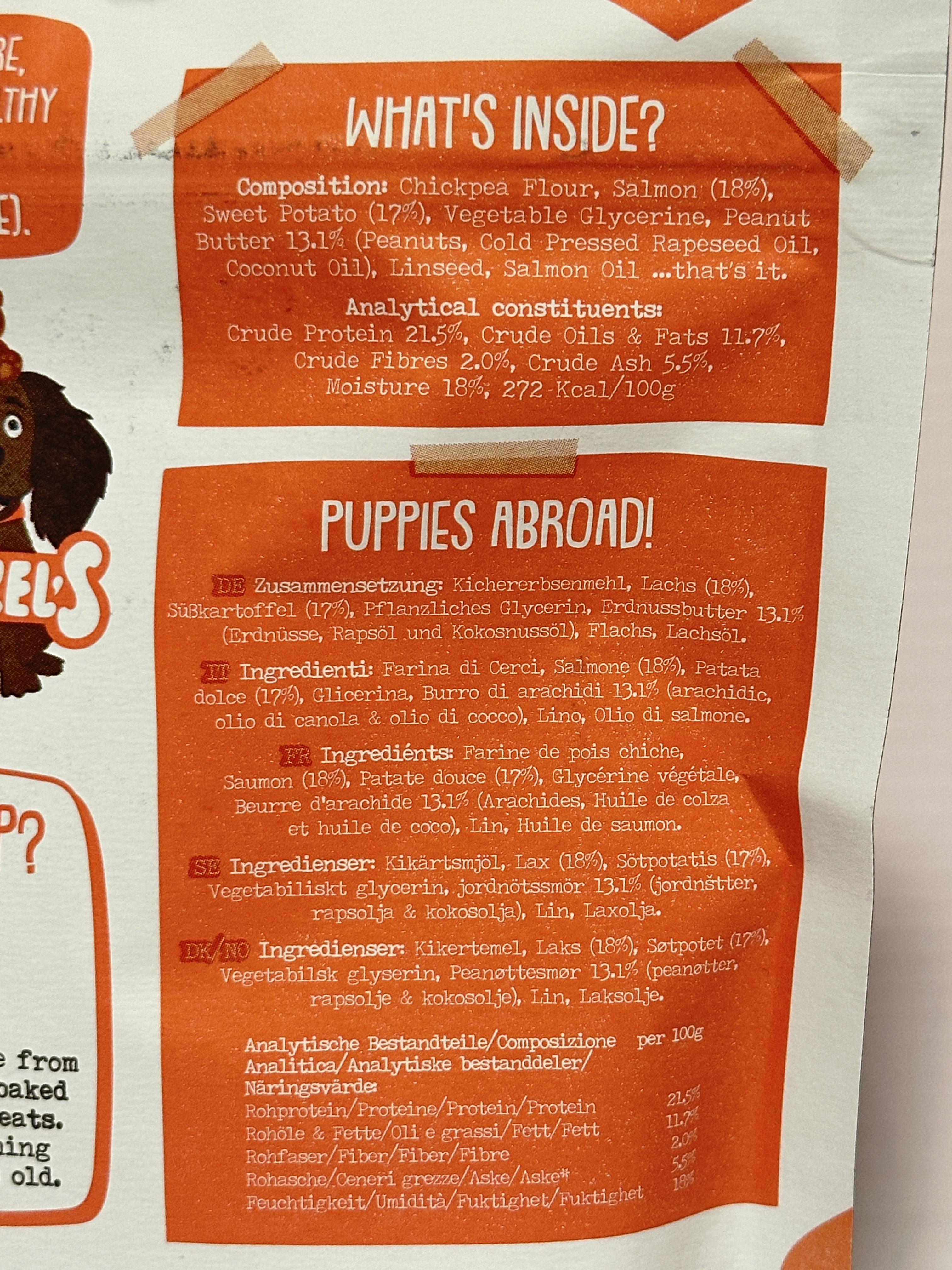 Ingredients: Chickpea flour, salmon (18%), sweet potato (17%), vegetable glycerine, peanut butter (13.1%) [peanuts, cold pressed rapeseed oil, coconut oil], linseed, salmon oil.