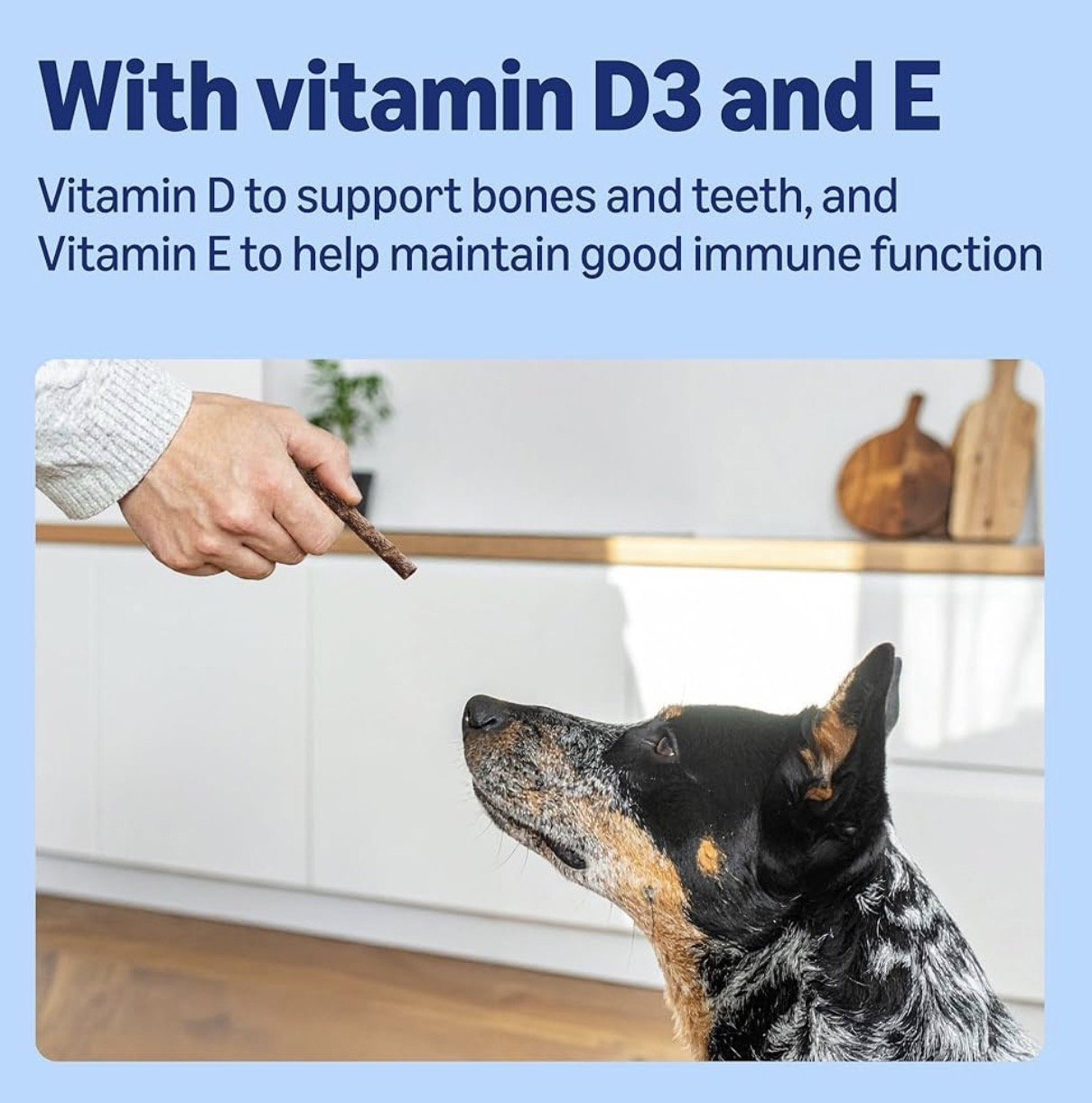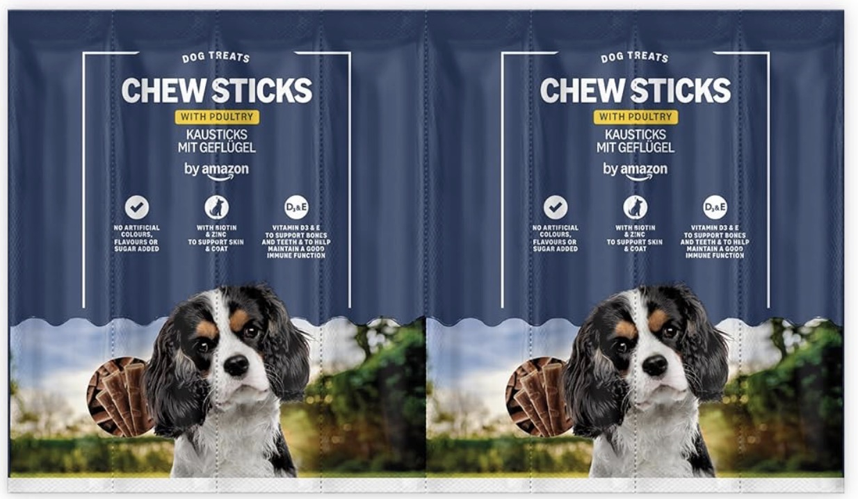 These chew sticks are made with poultry and include chicory inulin, biotin, zinc, vitamin D3 and vitamin E as listed in the product information provided. The sticks can be broken into smaller pieces, making them practical for different dog sizes and reward moments.