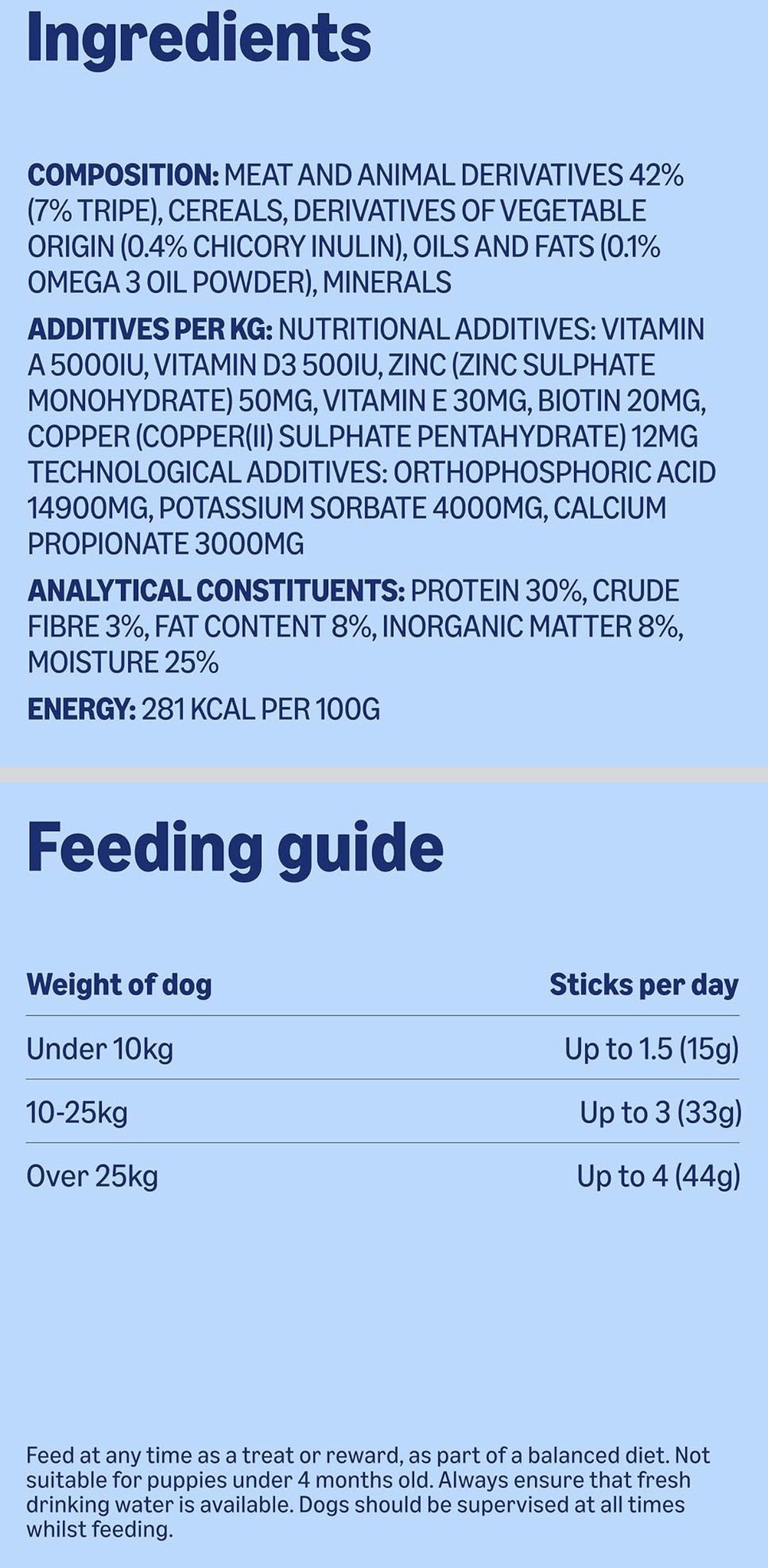 10-25kg: Up to 3 sticks per day (33g)