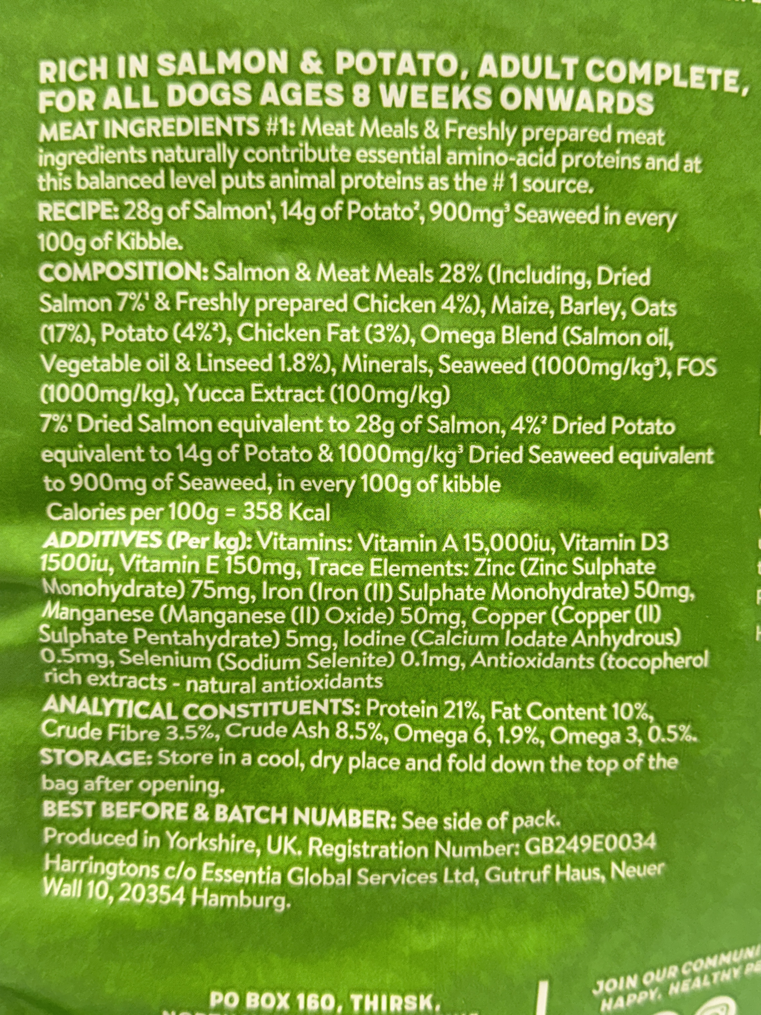 Salmon & meat meals 28% (including dried salmon 7% and freshly prepared chicken 4%), maize, barley, oats (17%), potato (4%), chicken fat (3%), omega blend (salmon oil, vegetable oil & linseed 1.8%), minerals, seaweed (1000mg/kg), FOS (1000mg/kg), yucca extract (100mg/kg).