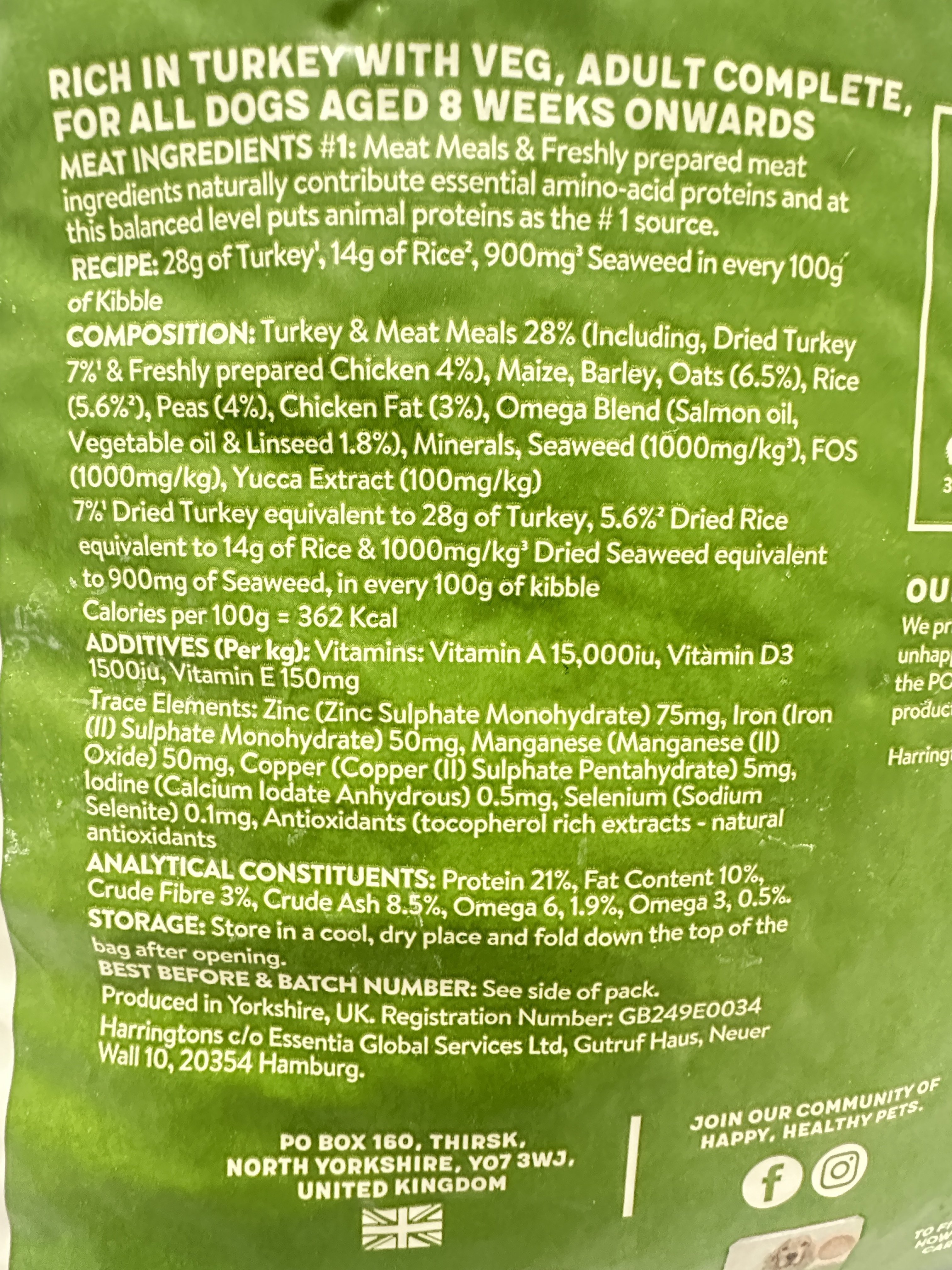 Turkey & meat meals 28% (including dried turkey 7% and freshly prepared chicken 4%), maize, barley, oats (6.5%), rice (5.6%), peas (4%), chicken fat (3%), omega blend (salmon oil, vegetable oil & linseed 1.8%), minerals, seaweed (1000mg/kg), FOS (1000mg/kg), yucca extract (100mg/kg).