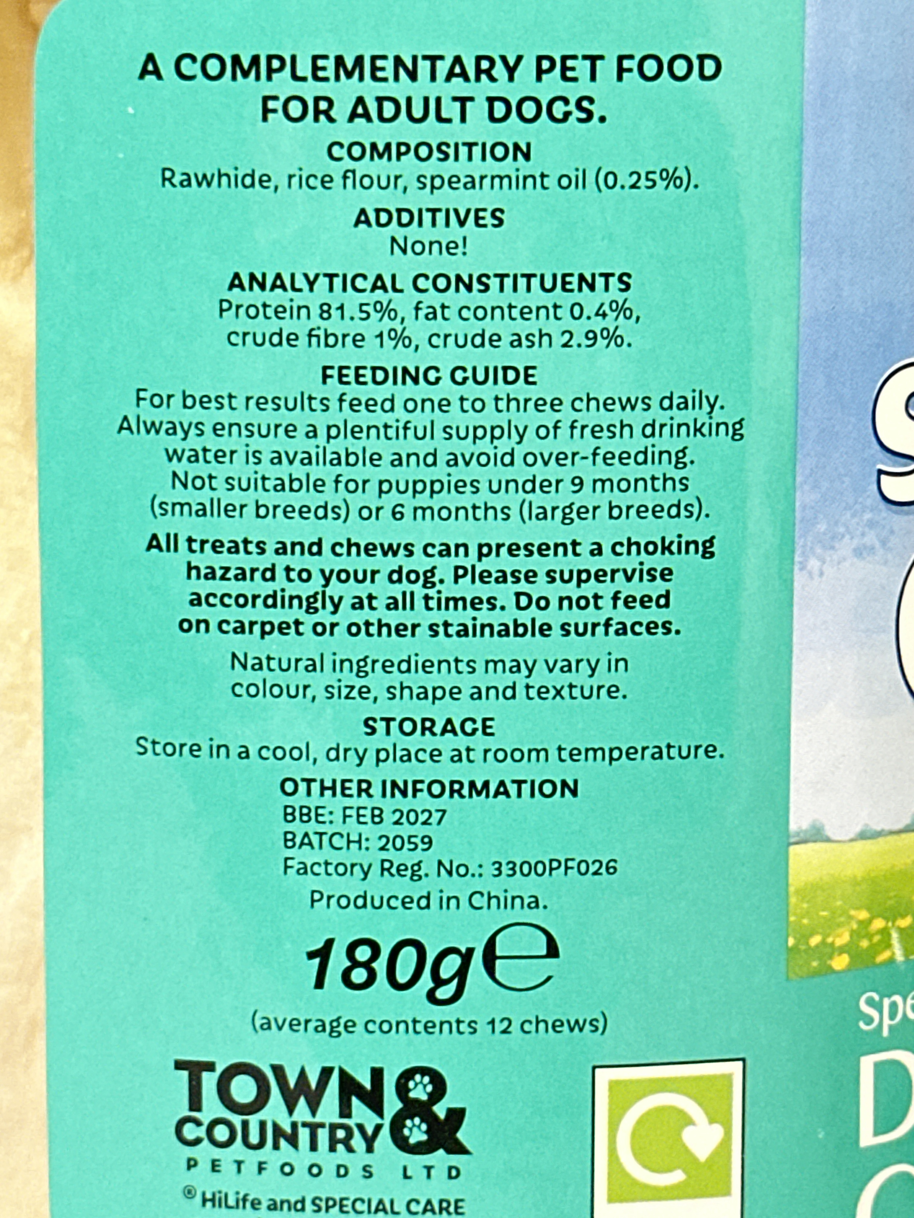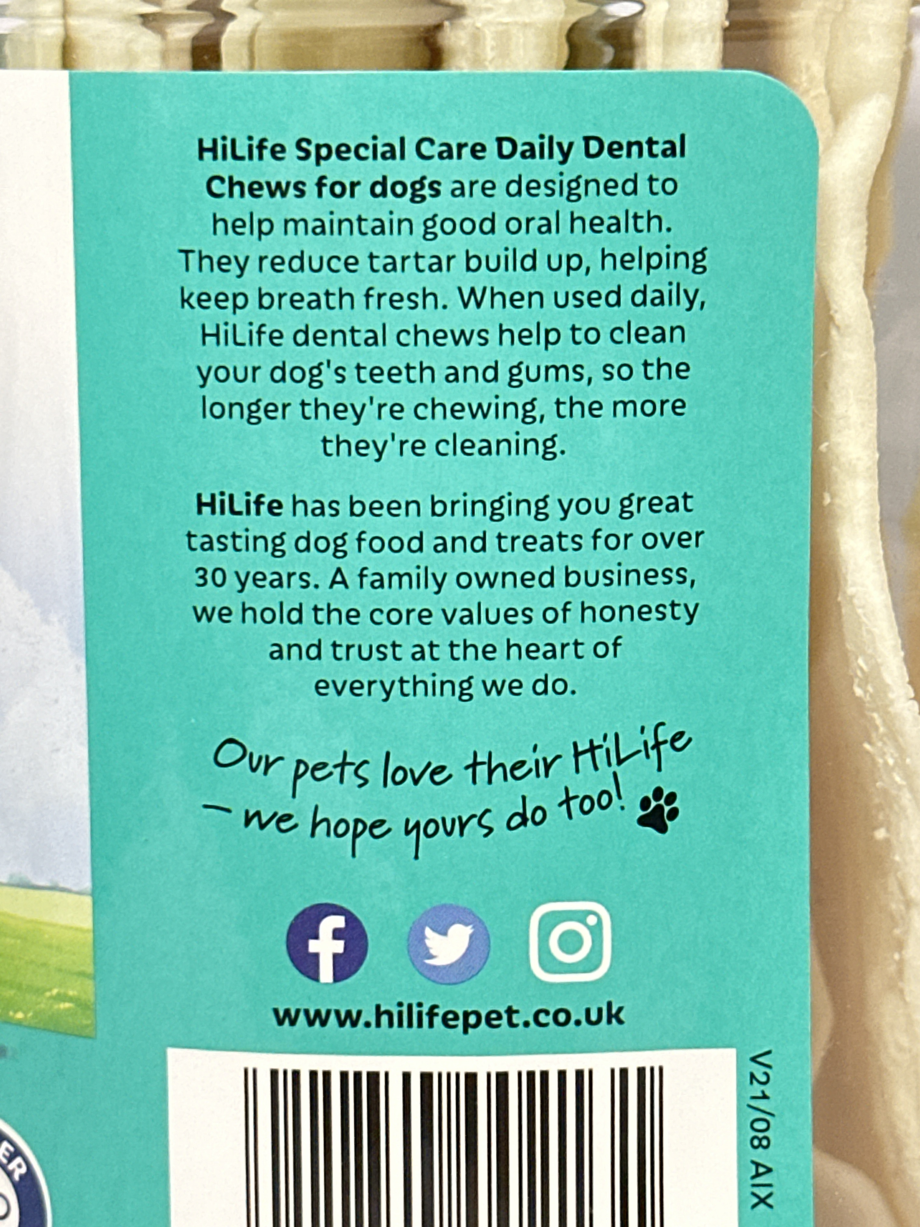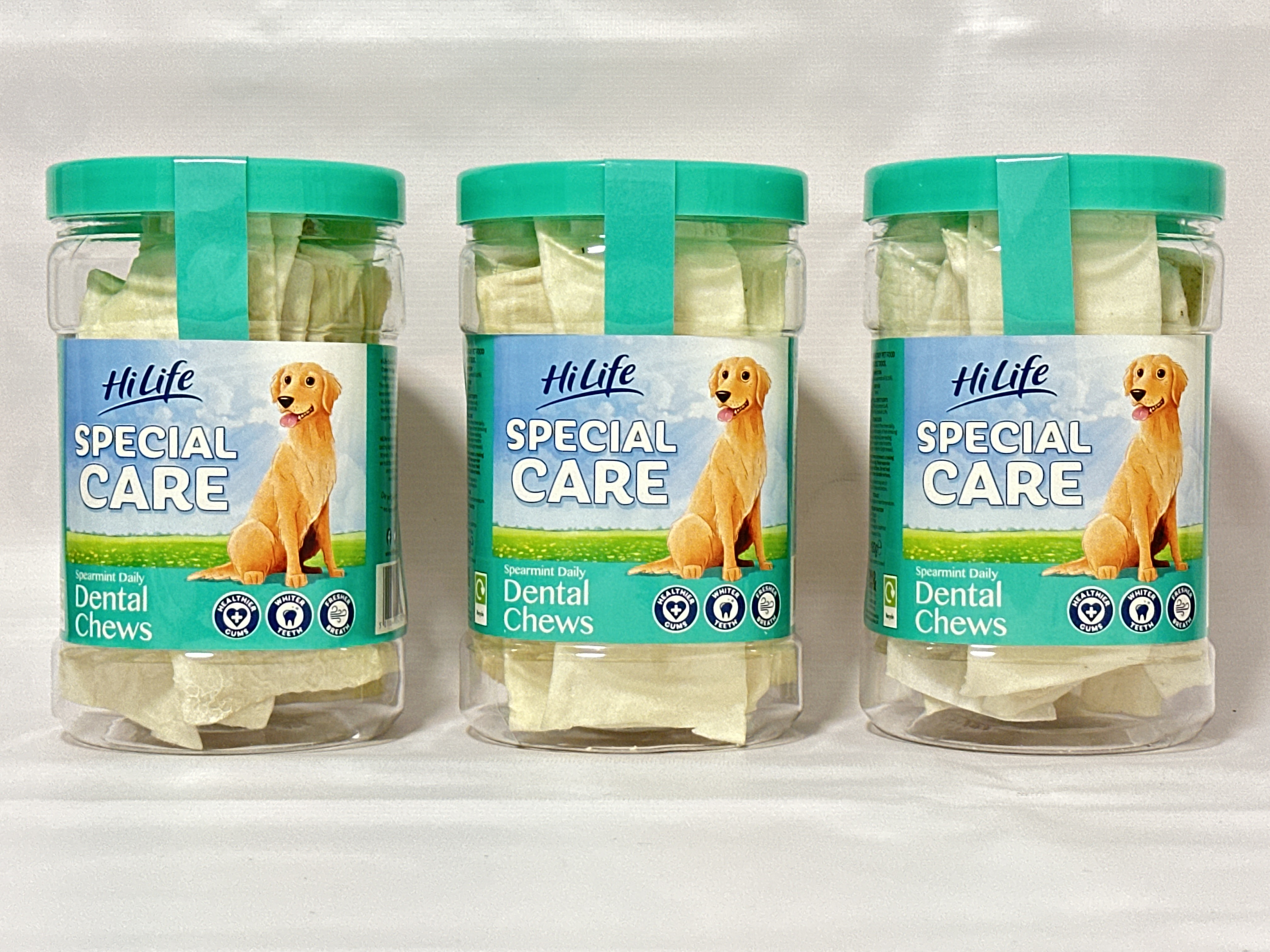 HiLife Special Care Daily Dental Chews are specially formulated to help maintain your dog’s oral hygiene. With a refreshing spearmint flavour, these chews help reduce tartar build-up, promote healthier gums, whiter teeth, and fresher breath when fed daily. The chewy texture and ridged design support mechanical cleaning action with every bite.