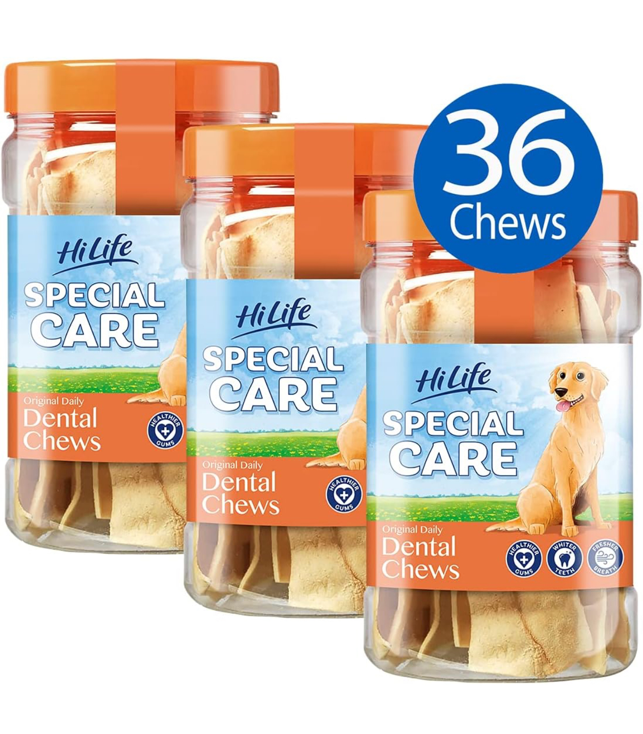 Special Care Daily Dental Chews are designed to support your dog’s oral health with regular use. These chews help clean teeth, freshen breath, and reduce tartar build-up thanks to their textured shape and active ingredients. Each pack contains 36 chews, ideal for a month of daily dental support.