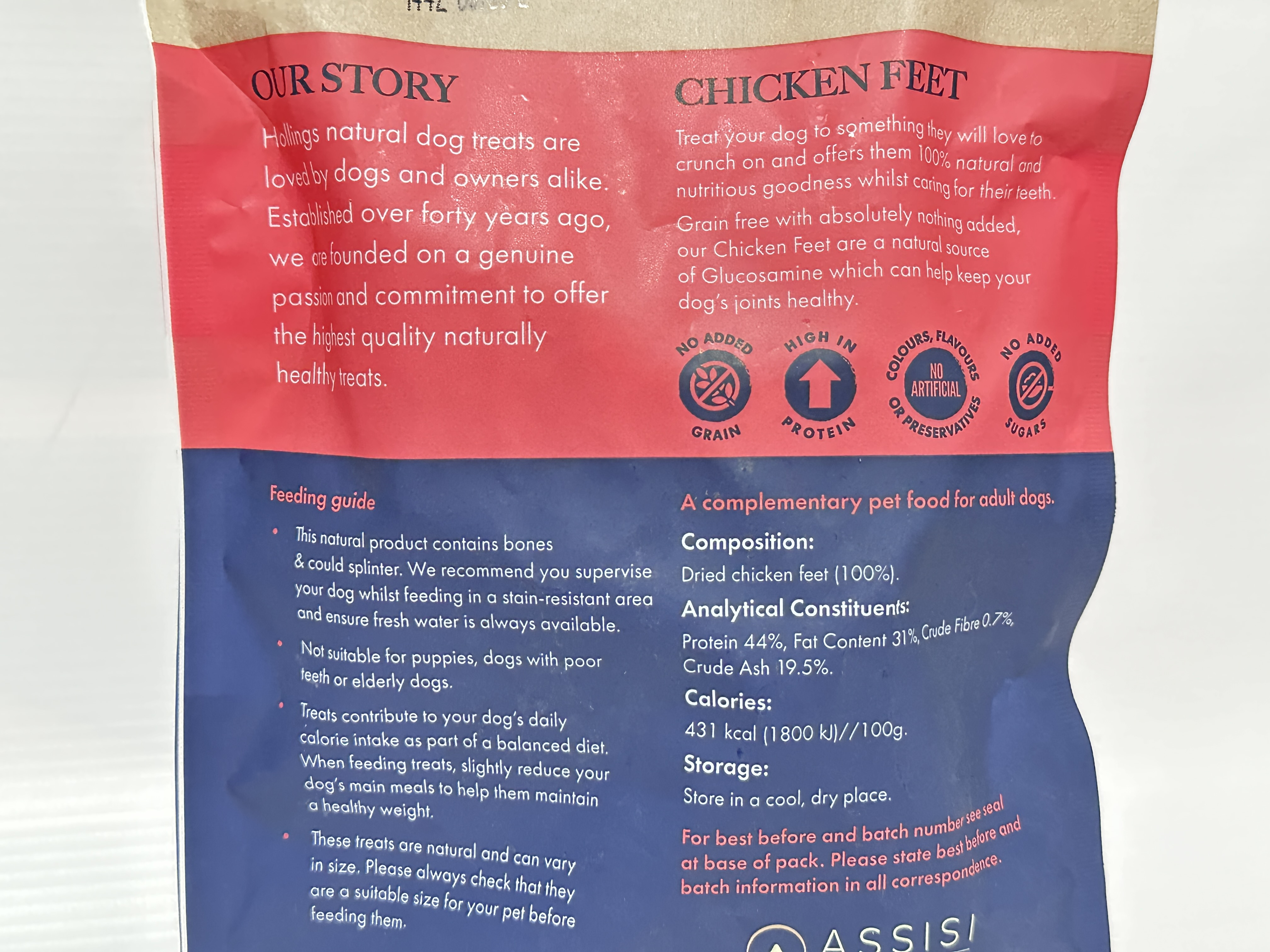 Completely grain free with no added sugars, colours, flavours, or preservatives, these treats are a wholesome and natural option for rewarding your dog. Perfect for adult dogs, Hollings Chicken Feet are a high-quality, naturally healthy snack your dog will love to crunch on.