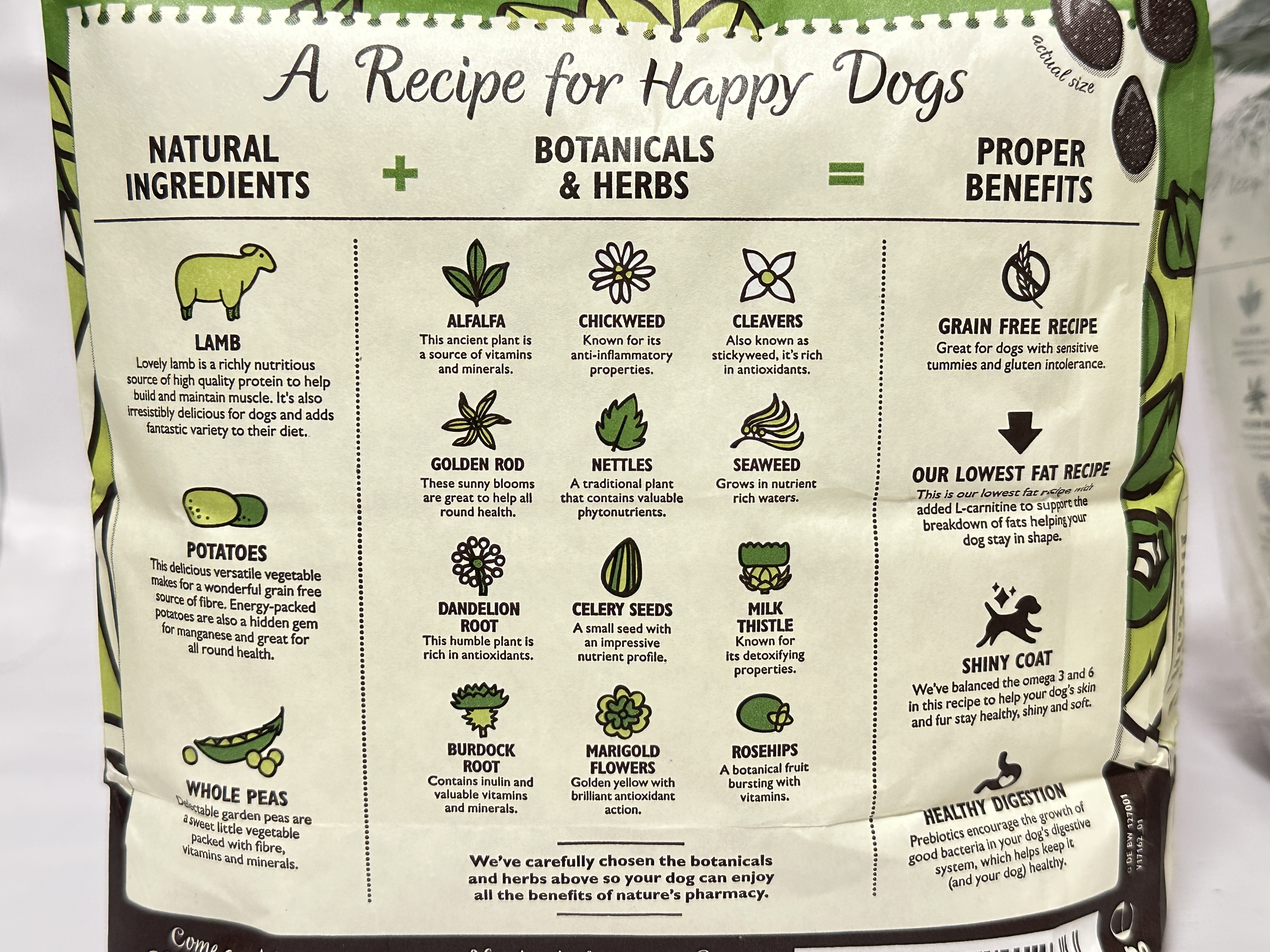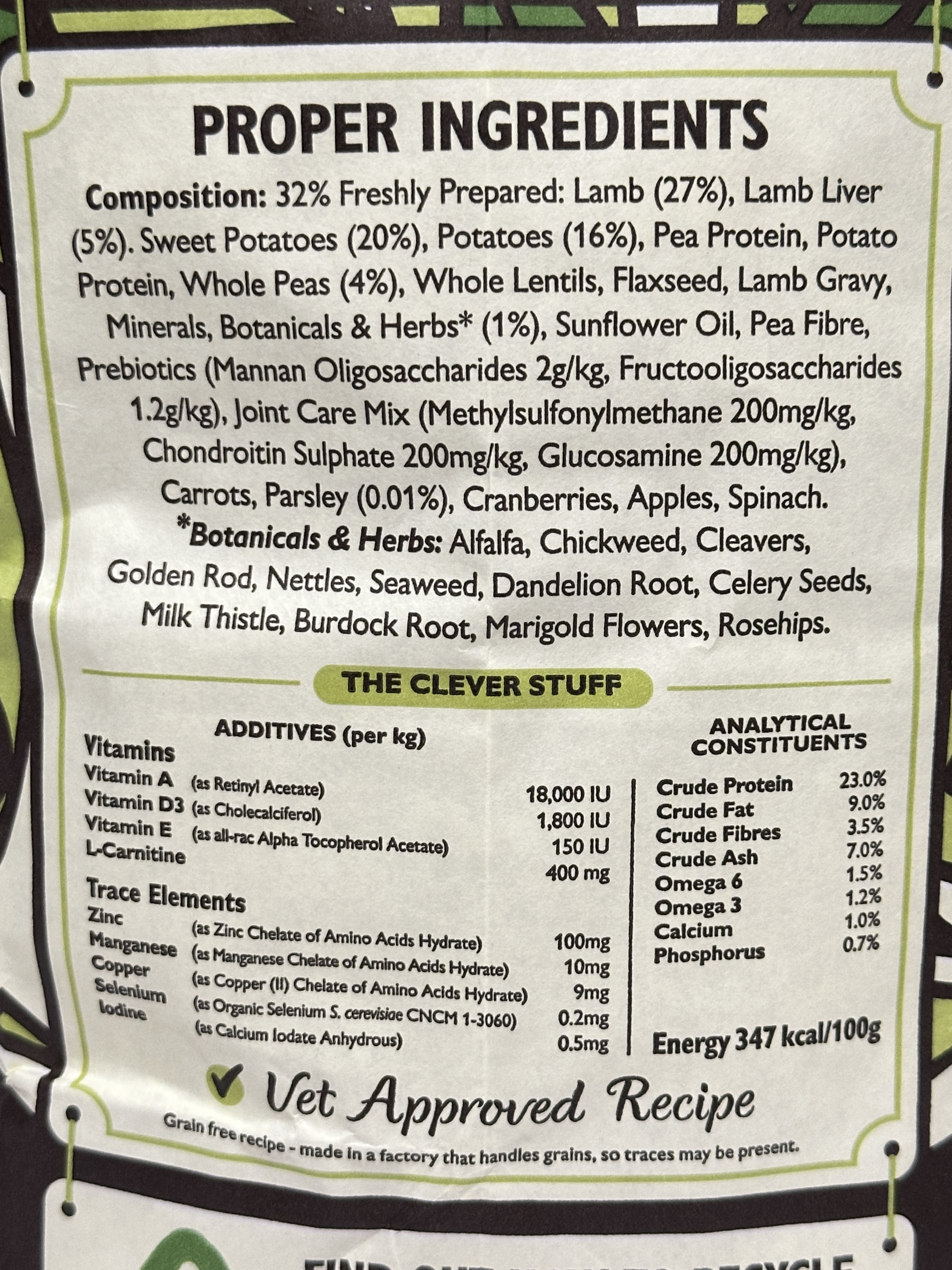 Freshly prepared lamb (27%), lamb liver (5%), sweet potatoes (20%), potatoes (16%), pea protein, potato protein, whole peas (4%), lentils, flaxseed, lamb gravy, sunflower oil, pea fibre, botanicals & herbs (1%) including alfalfa, nettles, seaweed, dandelion root, celery seeds, milk thistle, burdock root, marigold flowers, rosehips; plus cranberries, apples, spinach.