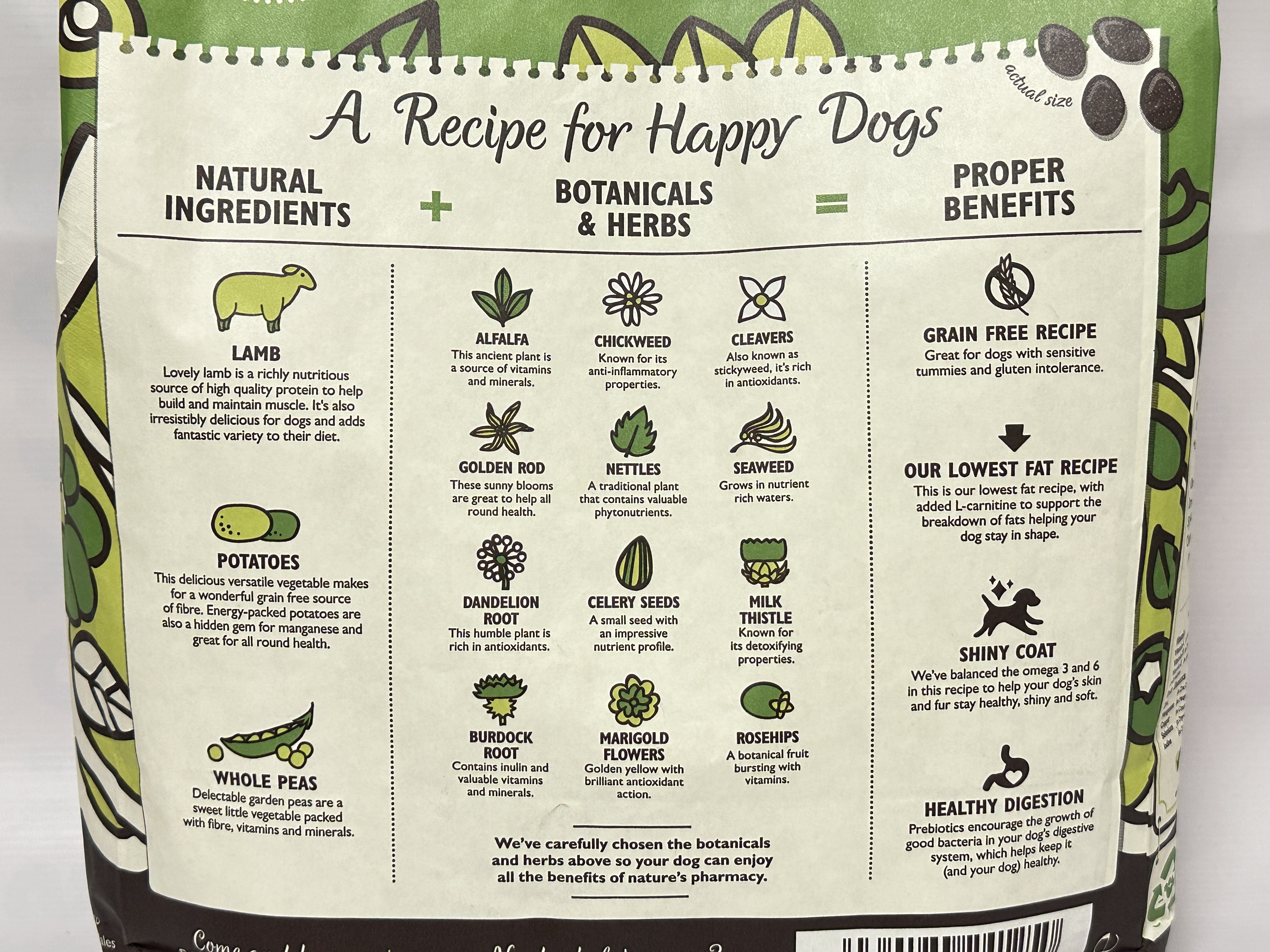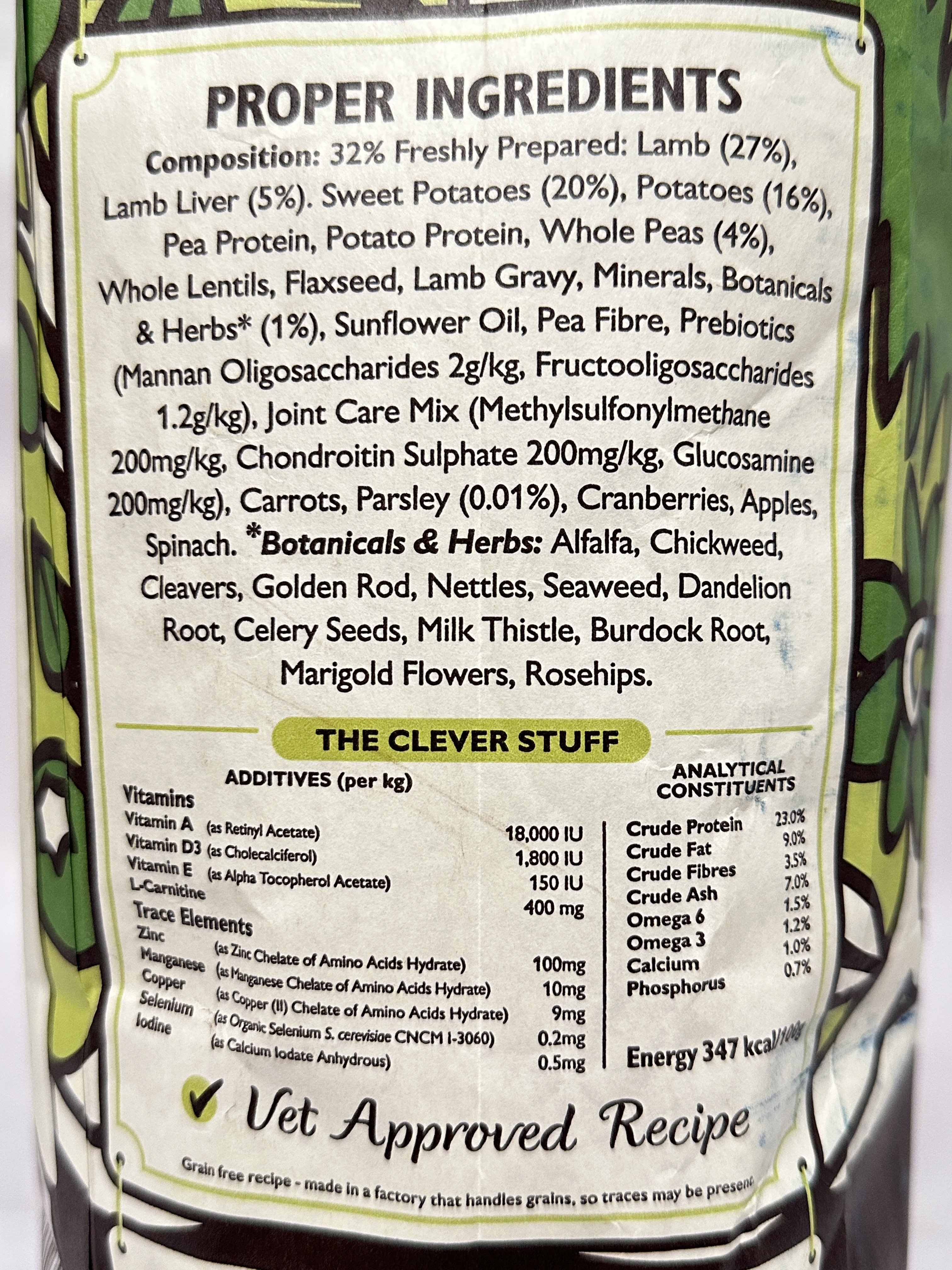 32% freshly prepared lamb (27%), lamb liver (5%), sweet potatoes (20%), potatoes (16%), pea protein, potato protein, whole peas (4%), lentils, flaxseed, lamb gravy, botanicals and herbs (1%), sunflower oil, pea fibre, prebiotics (MOS 2g/kg, FOS 1.2g/kg), joint care mix (MSM 200mg/kg, chondroitin sulphate 200mg/kg, glucosamine 200mg/kg), carrots, parsley (0.01%), cranberries, apples, spinach.