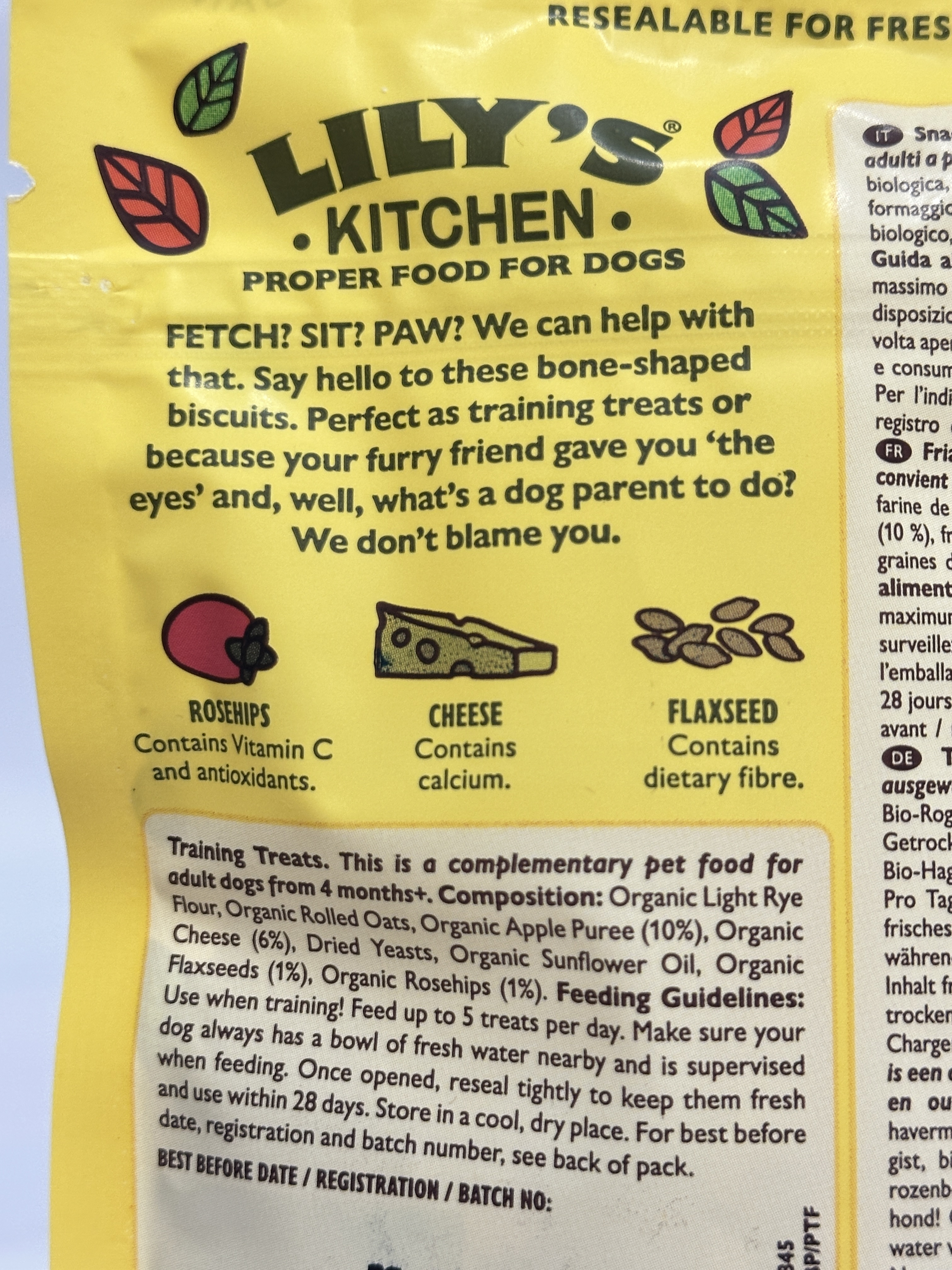 Reward your dog the natural way with Lily’s Kitchen Training Treats with Cheese & Apple. Made with organic ingredients including apple puree, cheese, oats, flaxseed and rosehips, these crunchy bone-shaped biscuits are perfect for training or everyday rewarding. Suitable for adult dogs and puppies from 4 months old, these treats support overall wellbeing while keeping tails wagging.