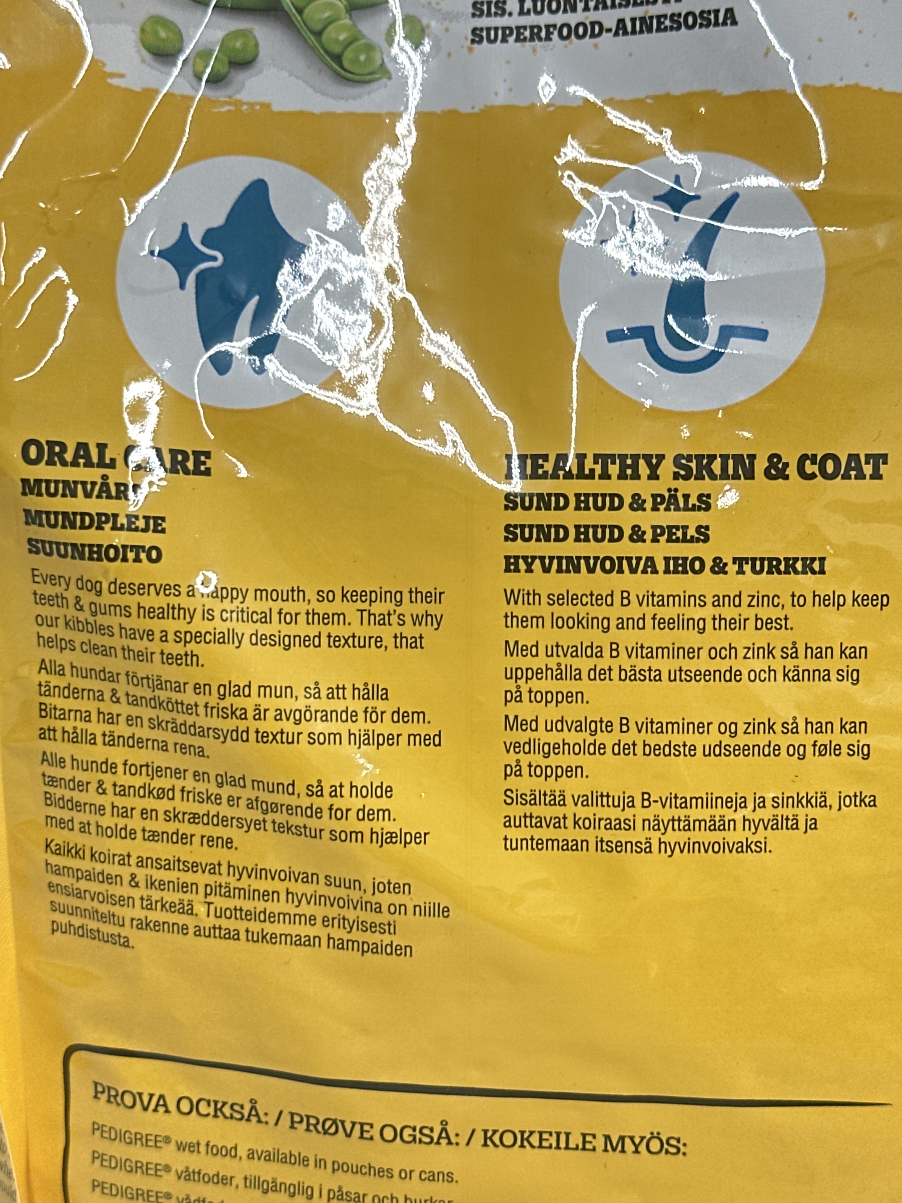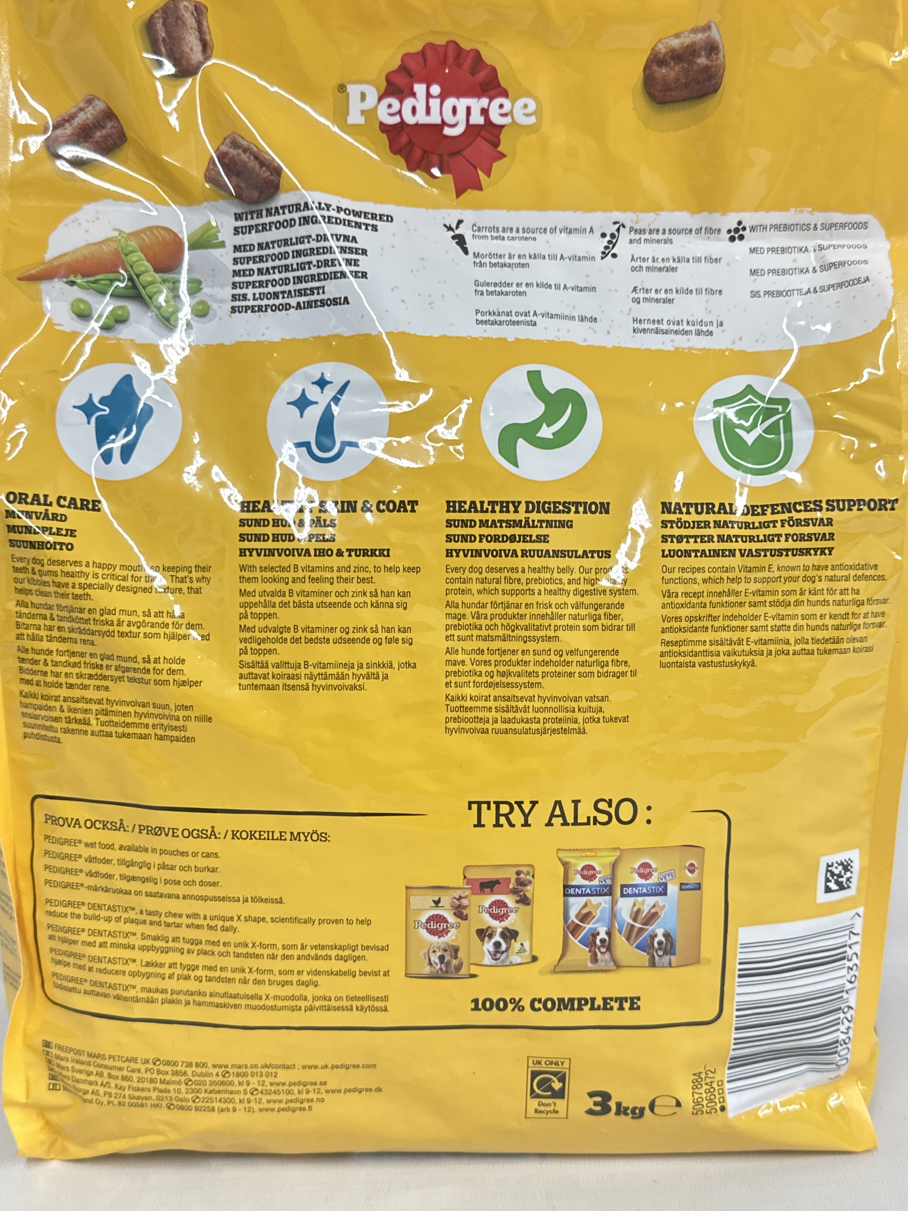 The recipe contains protein to help support muscle maintenance, fats for energy, fibre to aid digestion, and essential minerals to support overall wellbeing. Suitable for feeding as a complete dry meal or combined with PEDIGREE wet food as part of a mixed feeding approach.