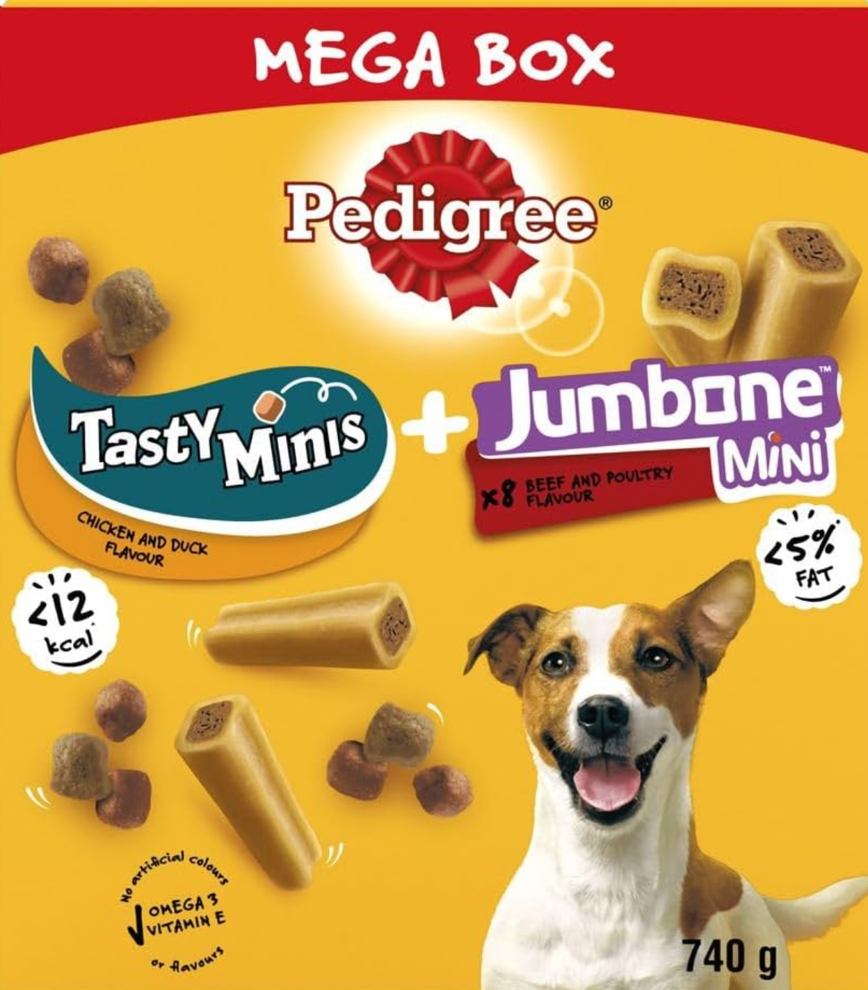 Reward your dog with the delicious variety of the Pedigree Mega Box. This 740g treat box contains a mix of three tasty Minis for training and eight Mini Jumbones for chewing satisfaction. Ideal for training sessions or daily rewards, each treat is designed to be tasty and nutritious.