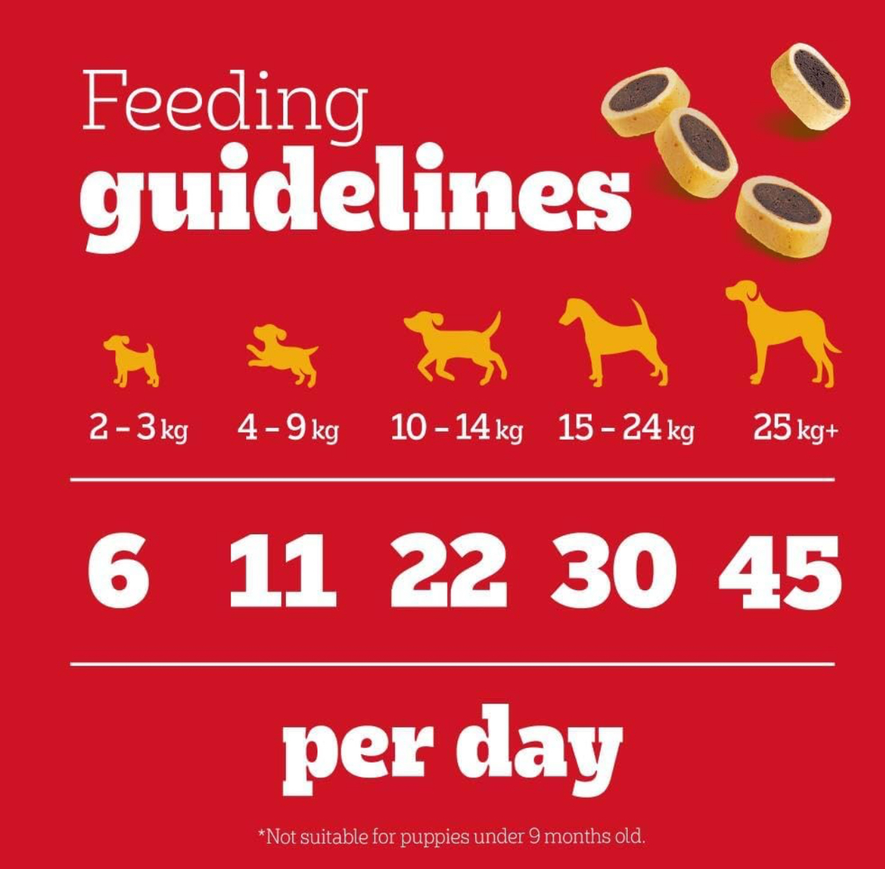 Feed as part of a balanced diet. Suitable for dogs of all sizes – adjust quantity based on dog’s weight and exercise.