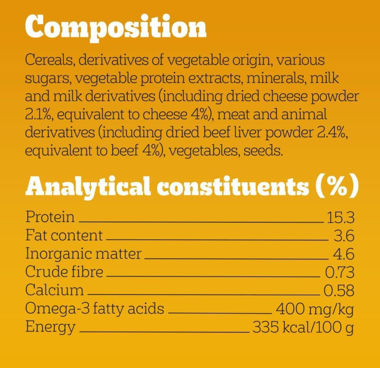 Contains Milk and Beef derivatives. Please refer to the packaging for latest details.