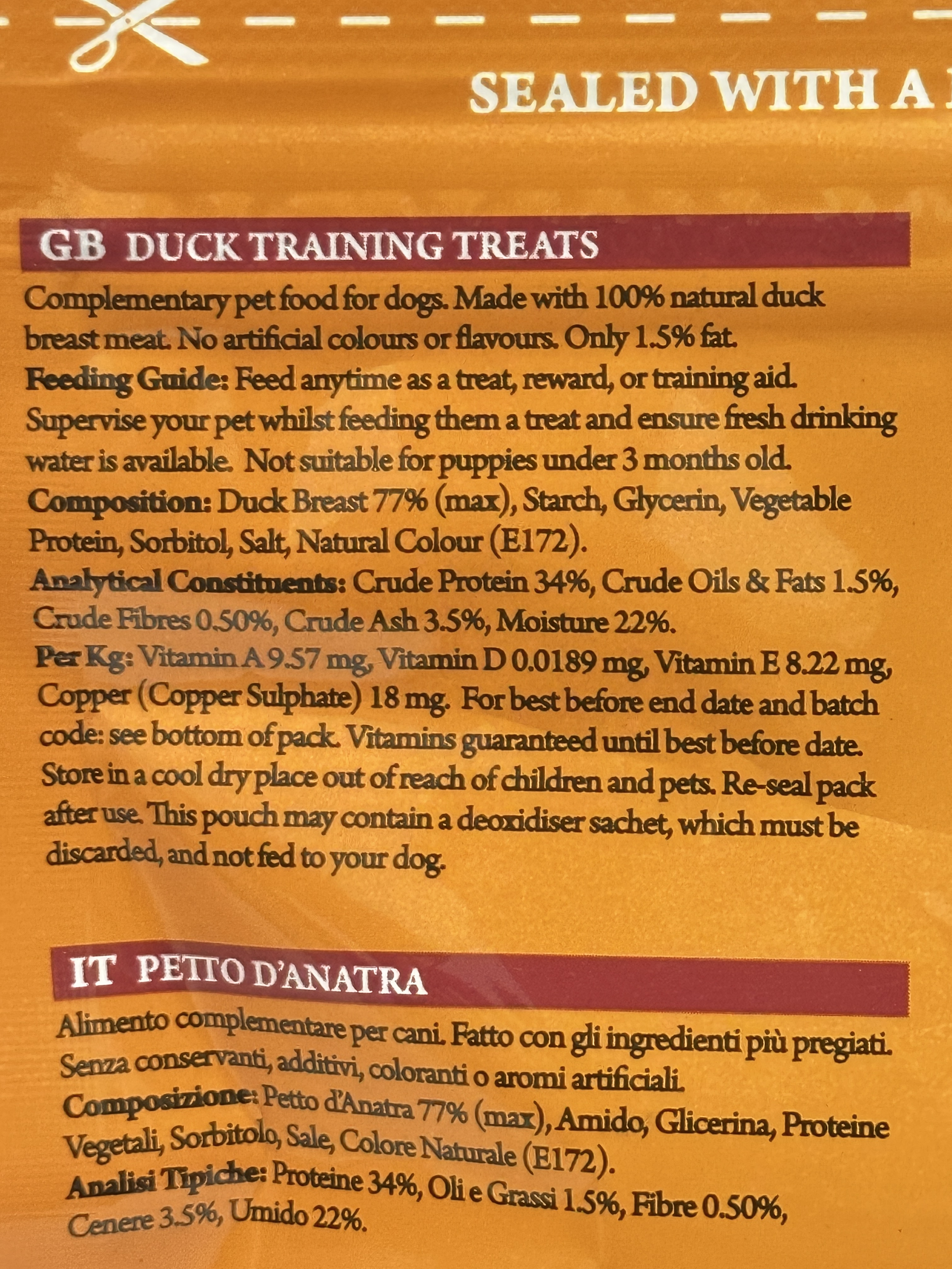 Duck Breast (77% max), Starch, Glycerin, Vegetable Protein, Sorbitol, Salt, Natural Colour (E172)