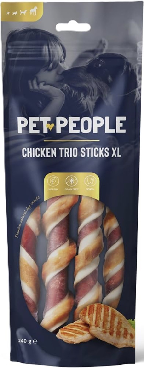 Pet People Chicken Trio Sticks XL are premium dog treats made with high meat content and designed as a tasty complementary snack for dogs. Each pack contains twisted chew sticks made with chicken and beef skin, creating a satisfying texture that dogs love while helping keep them occupied.
