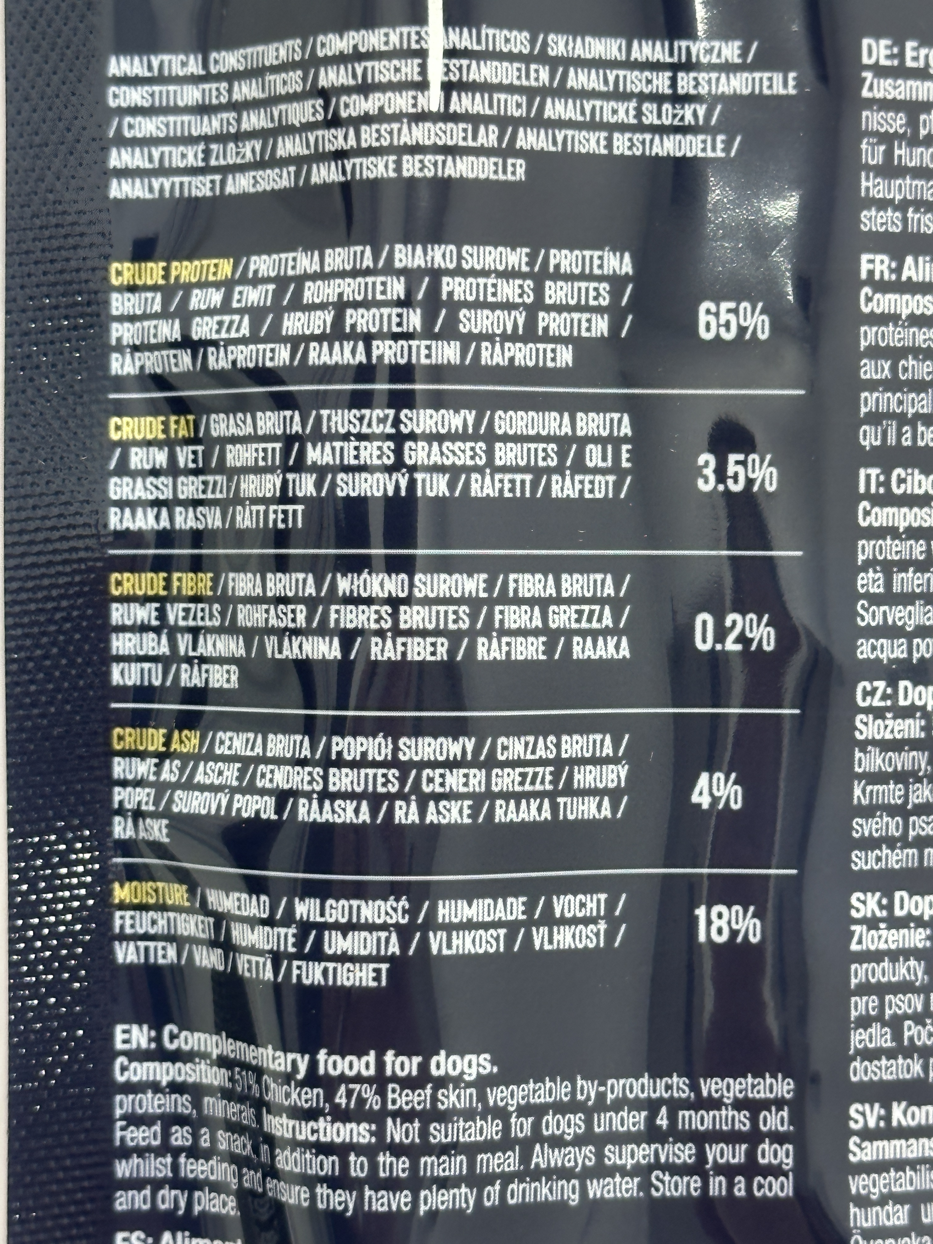 Chicken (51%), Beef Skin (47%), Vegetable By-Products, Vegetable Proteins, Minerals.