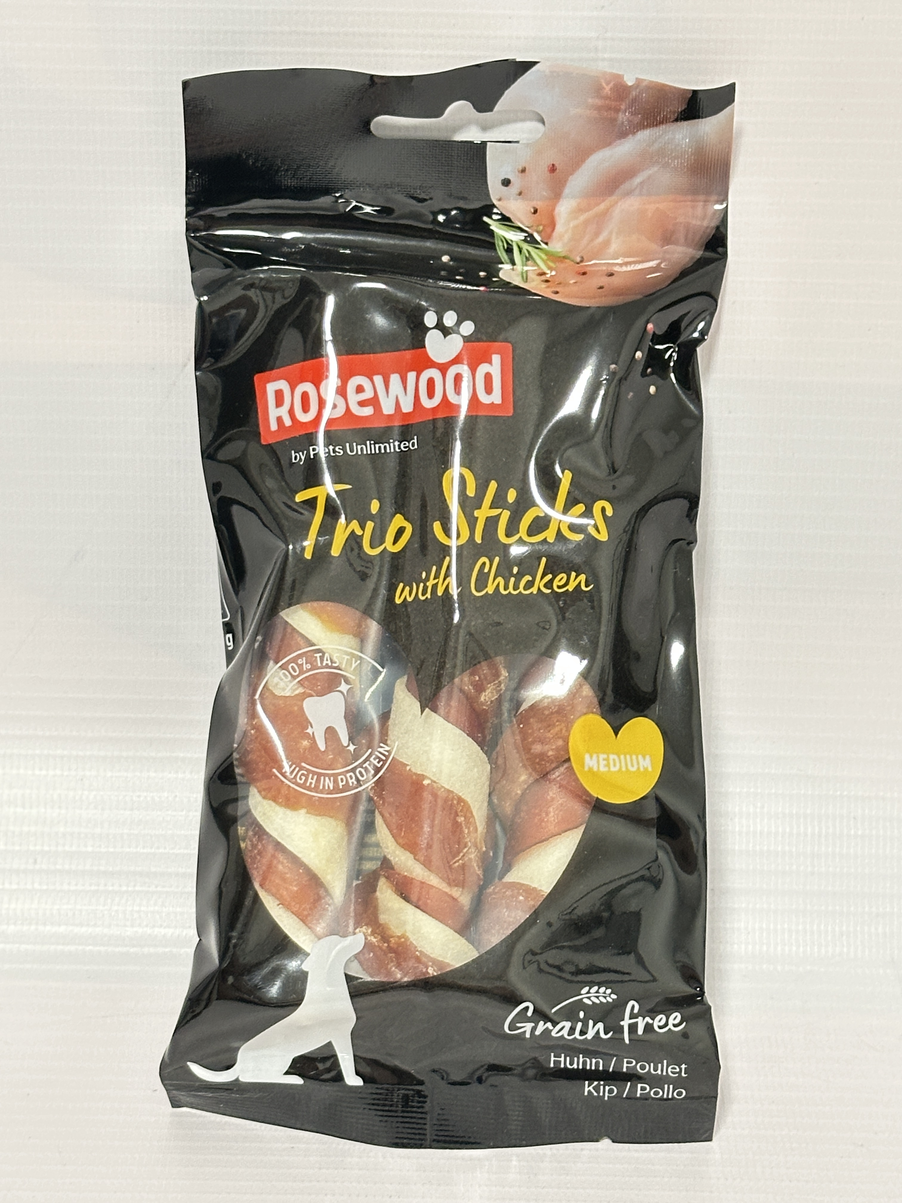 Treat your dog to a satisfying and nutritious chew with Rosewood Trio Sticks – Medium Size. Made with real chicken, these grain-free treats are high in protein and designed to support healthy teeth, gums and chewing satisfaction.