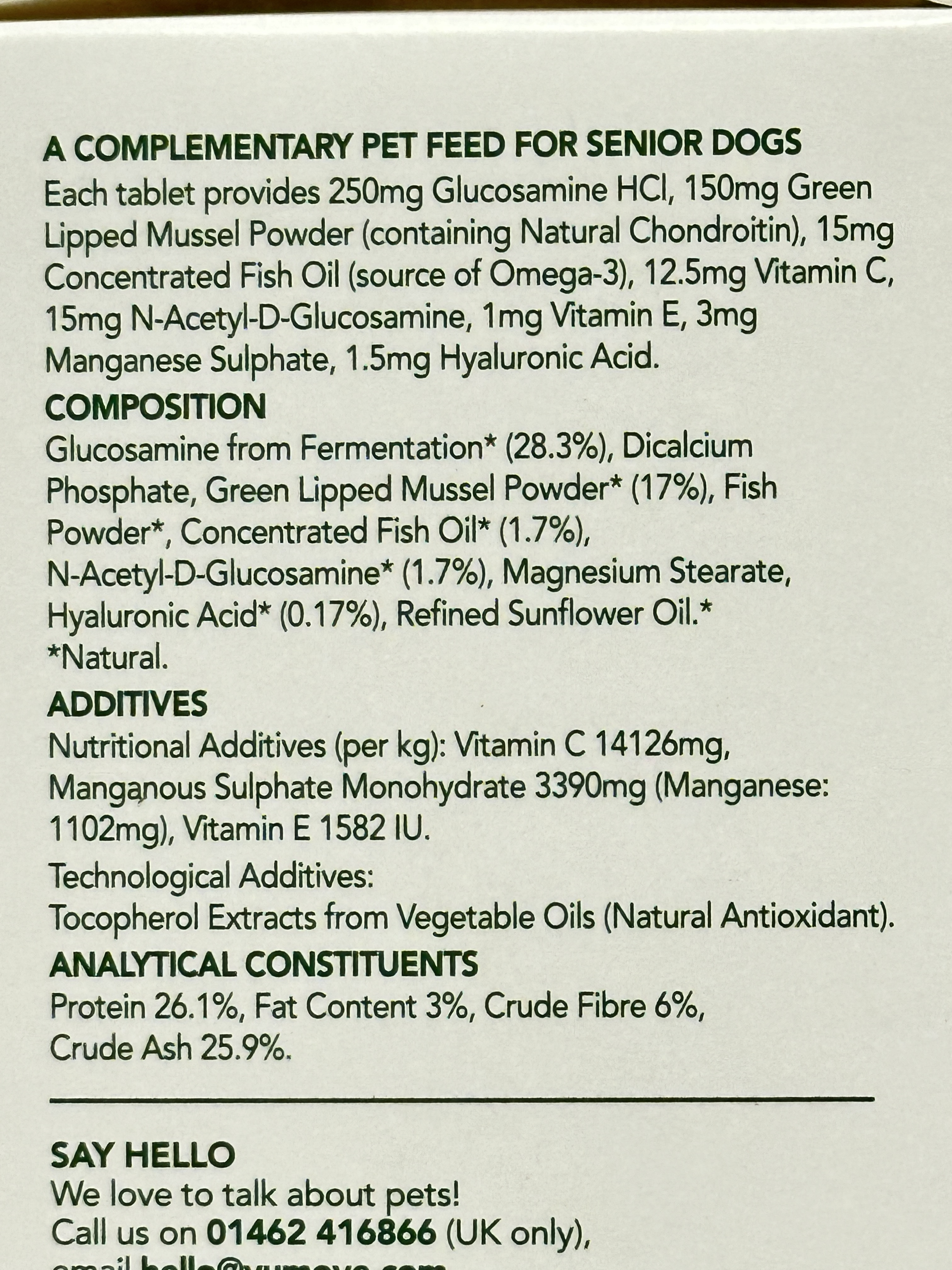 Support your older dog’s daily wellbeing with Senior Dog Joint Supplement (120 Tablets). Specially formulated for dogs aged 8+, these tasty tablets combine Glucosamine, Chondroitin, Hyaluronic Acid, Green Lipped Mussel, Fish Oil, and Antioxidants to help maintain healthy joints and mobility as dogs get older.