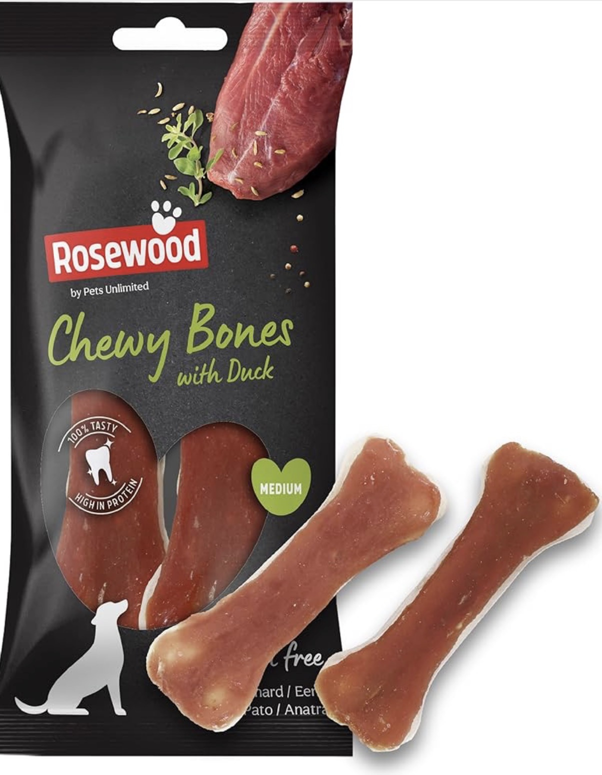 Rosewood Medium Chewy Bones for Dogs with Duck – Grain Free, High Protein Treats (2pc, 80g)