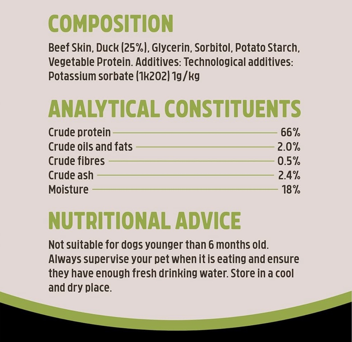 Composition: Beef Skin, Duck (25%), Glycerin, Sorbitol, Potato Starch, Vegetable Protein.