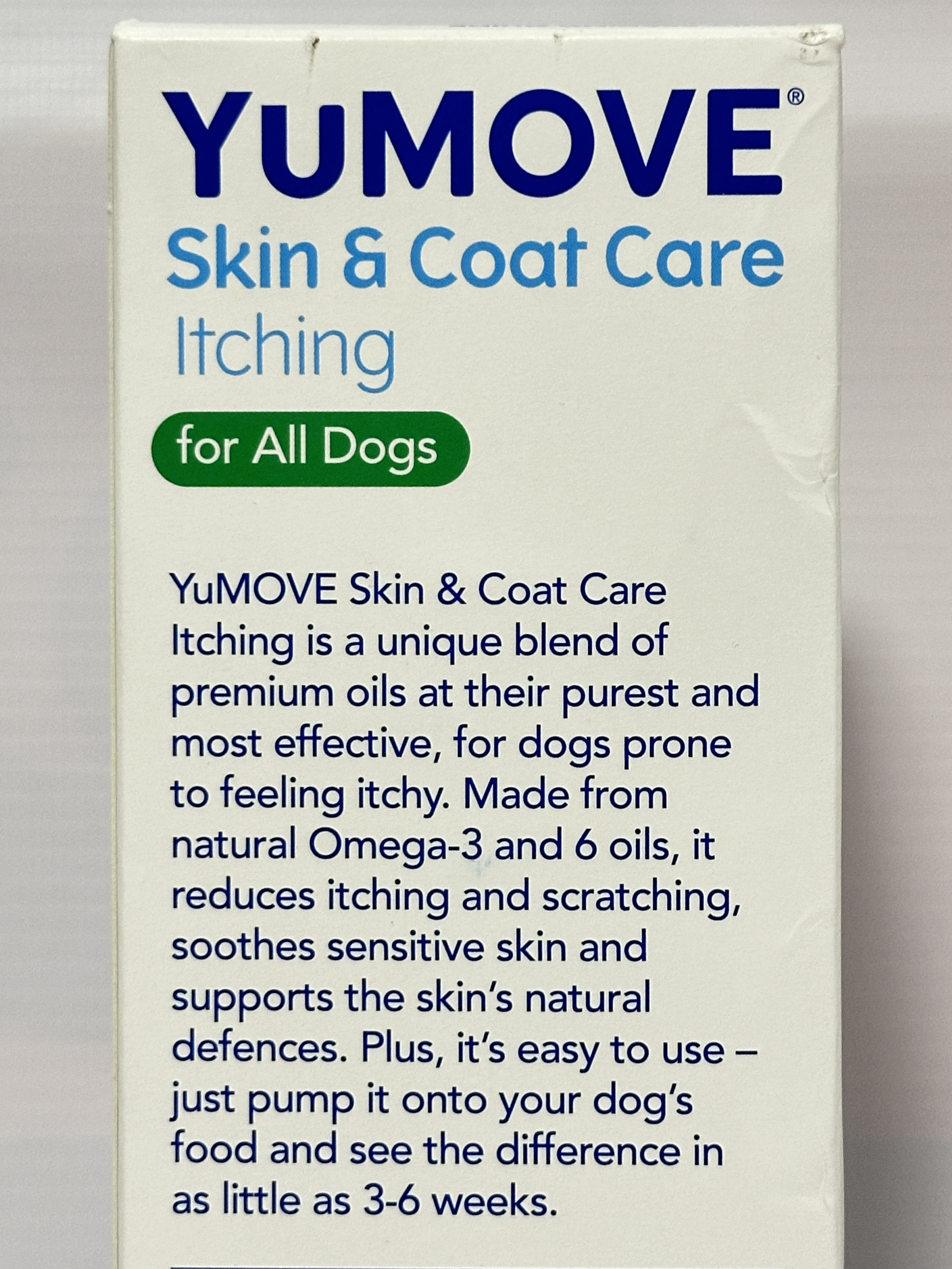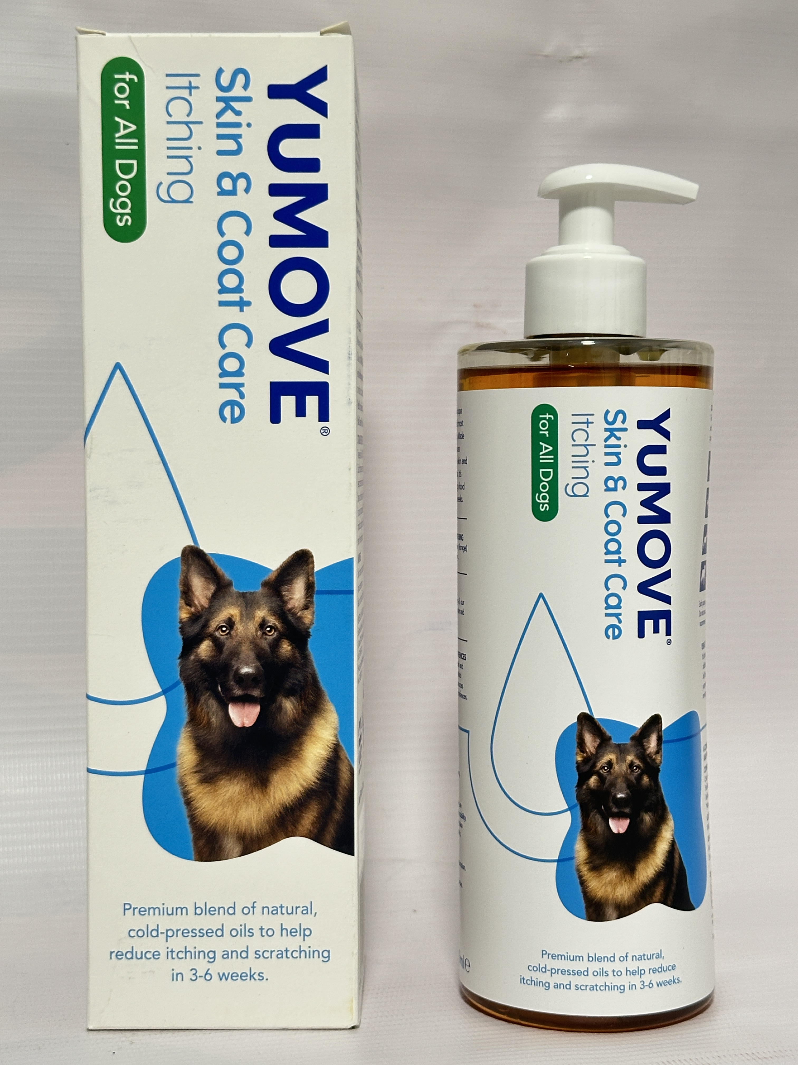 Support your dog’s skin health with YuMOVE Skin & Coat Care Itchy Skin Supplement, specially formulated for dogs with sensitive or irritated skin. This premium blend of cold-pressed natural oils – including golden flaxseed, salmon oil, purified fish oil, borage oil and sunflower oil – is enriched with Vitamin E to help reduce itching, scratching, and soothe sensitive skin. Packed with Omega-3 and Omega-6 fatty acids, this easy-to-use pump formula nourishes your dog’s coat, supports natural skin defences, and promotes overall skin health.