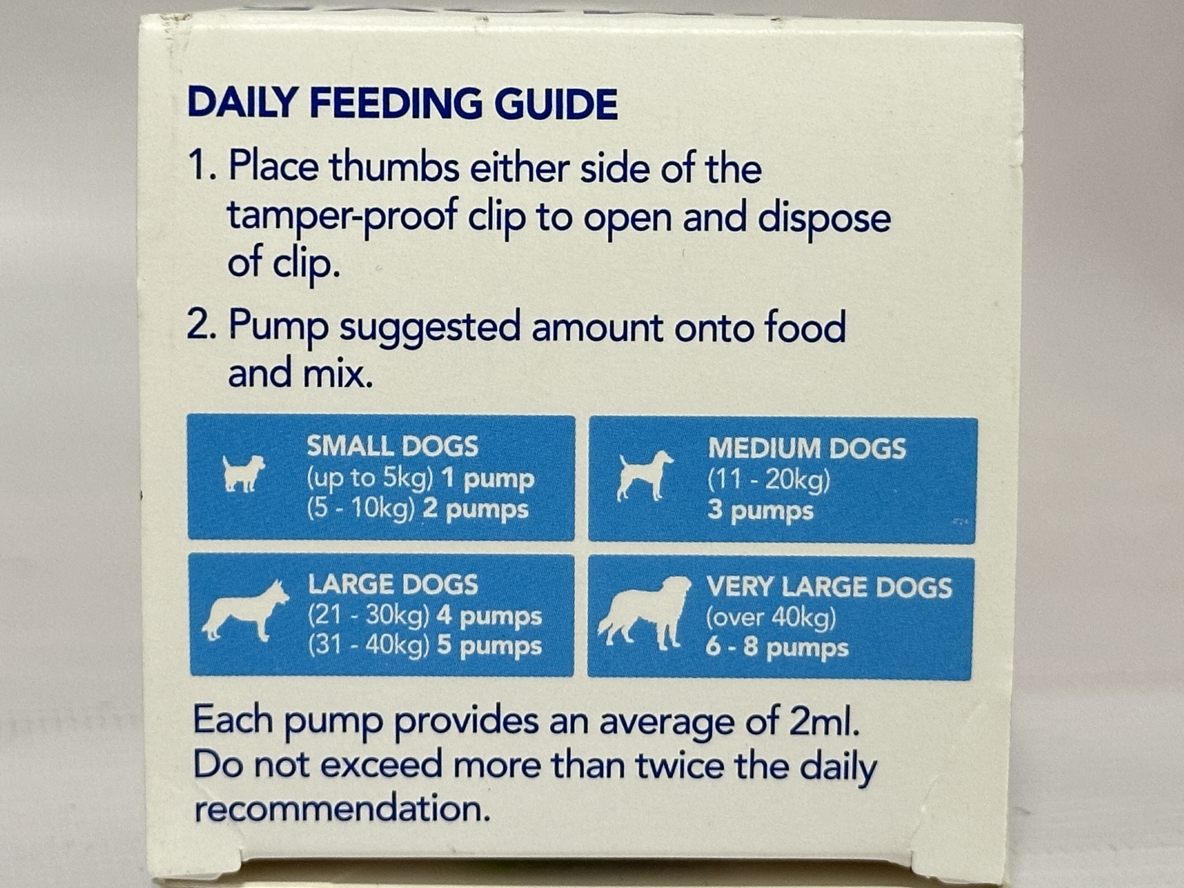 Simply pump the recommended amount onto your dog’s food for visible results in as little as 3–6 weeks. Suitable for dogs and puppies eating solids.