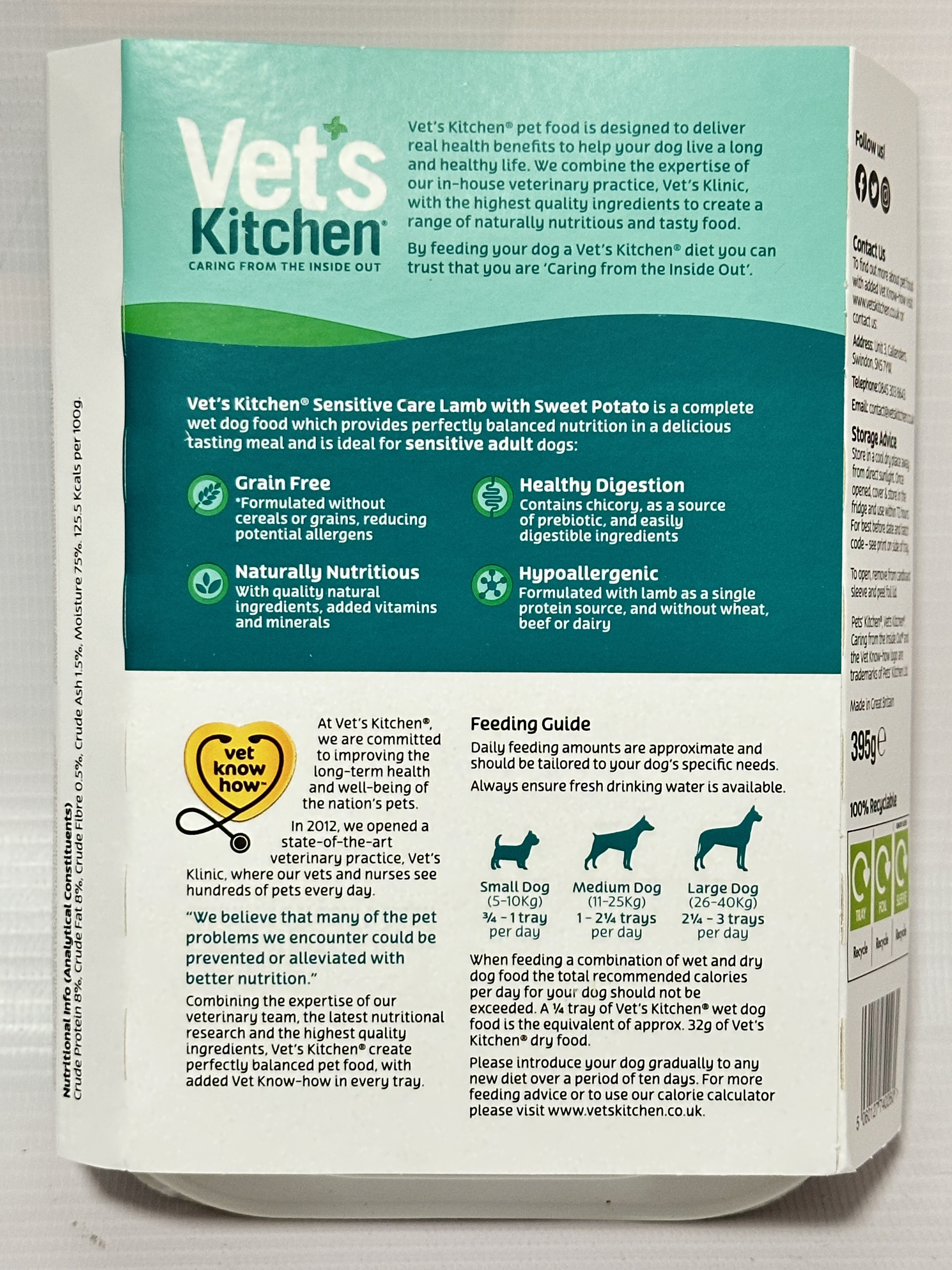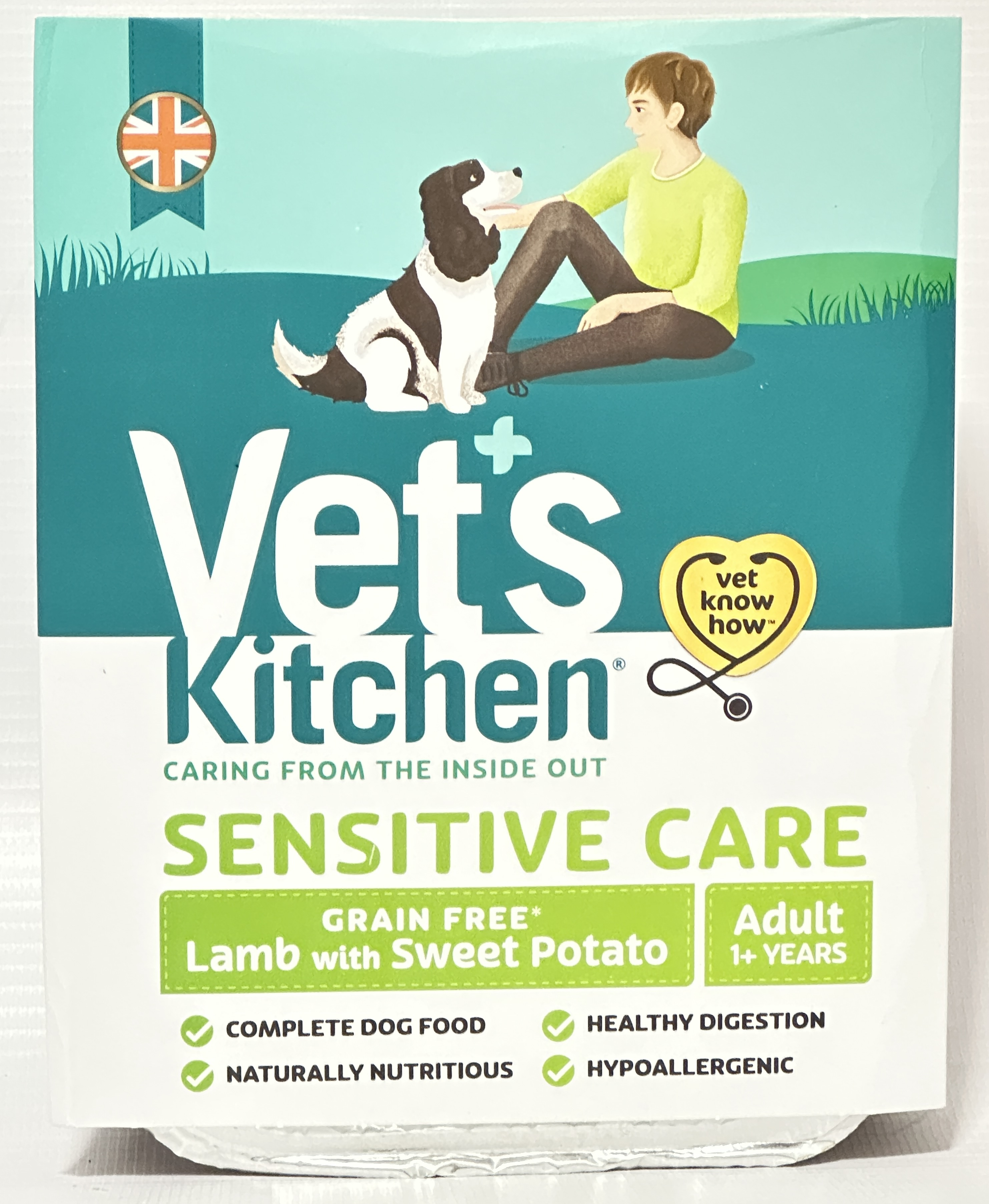 Vet’s Kitchen Sensitive Care Lamb with Sweet Potato is a complete, grain-free wet dog food designed specifically for adult dogs with sensitive digestion. Made in Britain and developed by vets, this carefully balanced recipe uses lamb as a single animal protein source, combined with sweet potato and natural ingredients to support digestive health and overall wellbeing.
