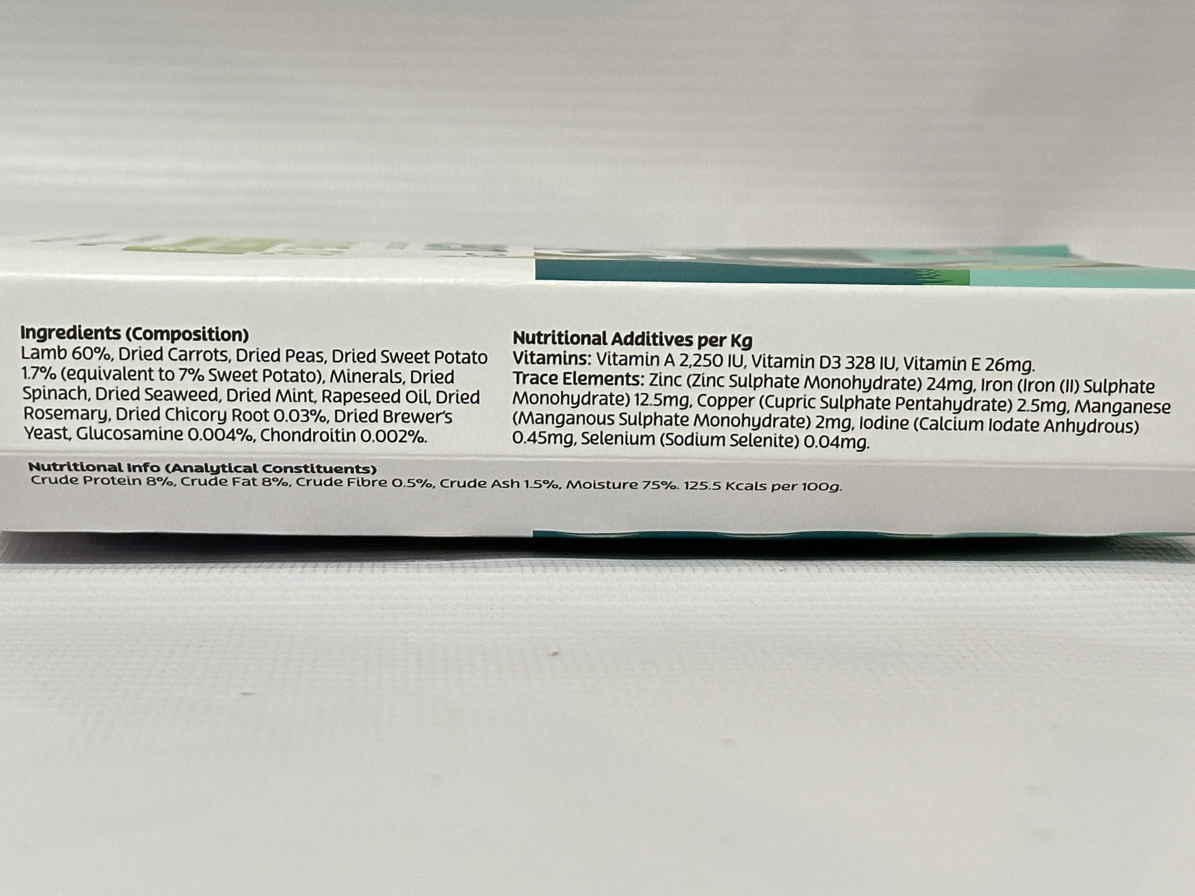 Lamb (60%), Dried Carrots, Dried Peas, Dried Sweet Potato (17% – equivalent to 7% sweet potato), Minerals, Dried Spinach, Dried Seaweed, Dried Mint, Rapeseed Oil, Dried Rosemary, Dried Chicory Root (0.03%), Dried Brewer’s Yeast, Glucosamine (0.004%), Chondroitin (0.002%).