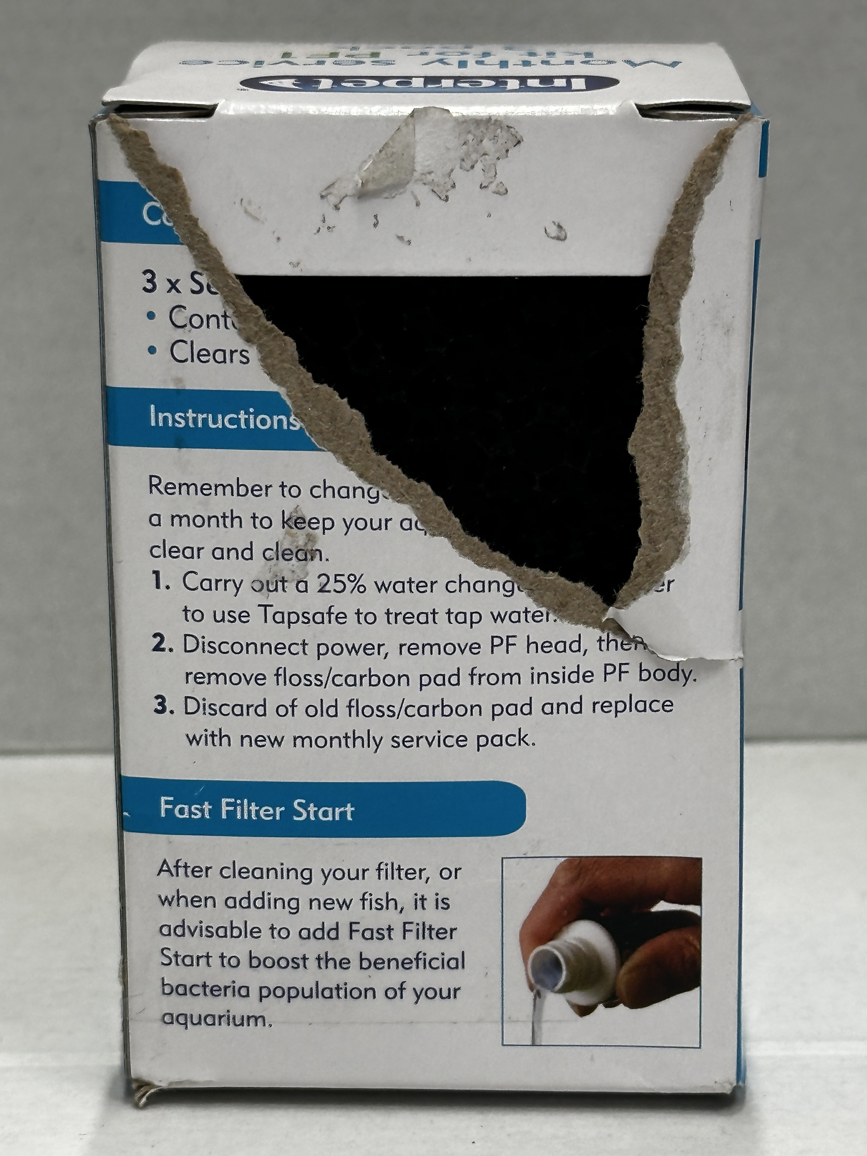 Replace the old floss and carbon pad with a new monthly service pad as part of normal filter maintenance. The box states to change the filter carbon and foam pads monthly for a healthy aquarium.