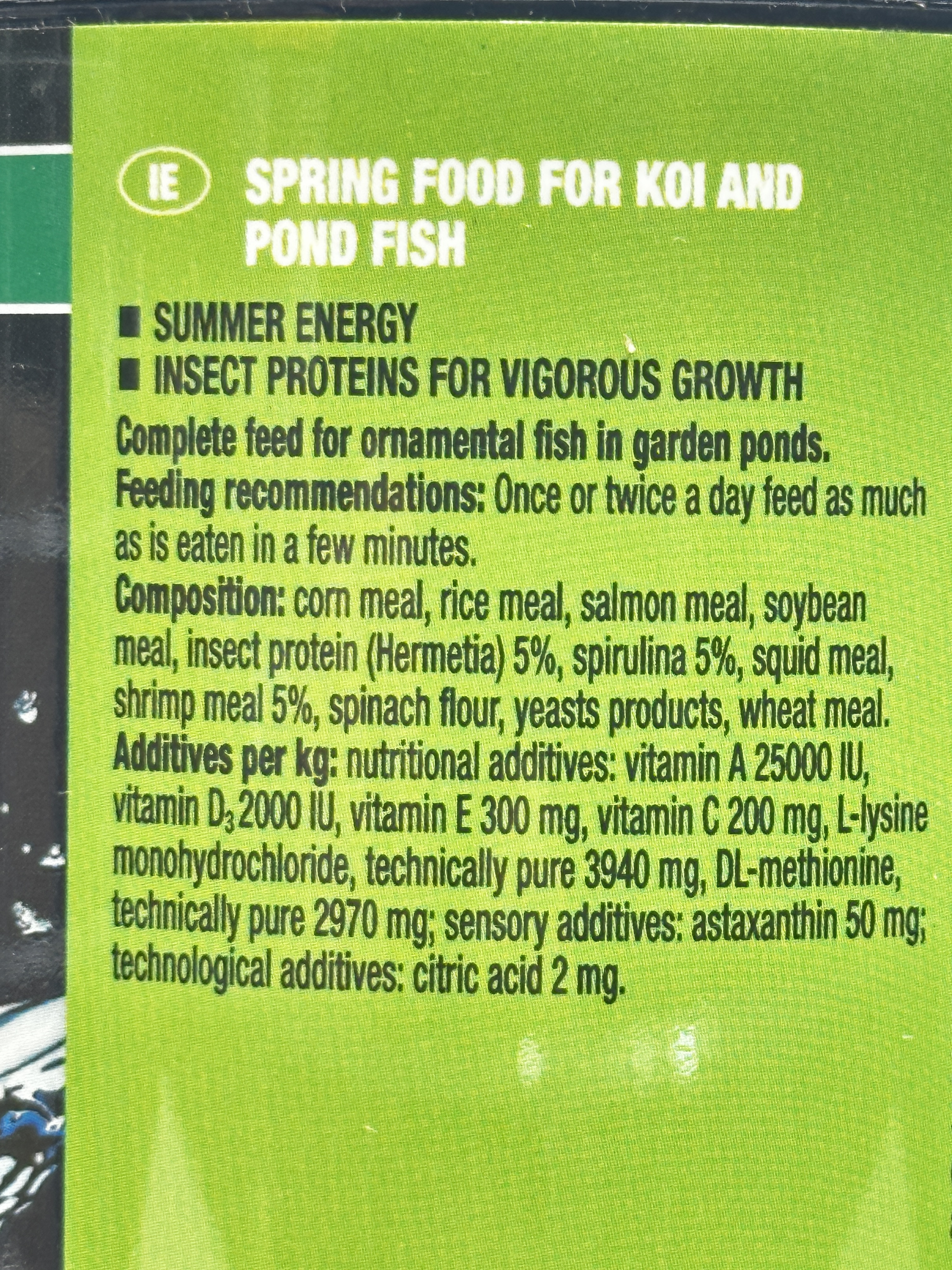 The label highlights spring food for koi and pond fish, natural energy optimised nutrition, 28% protein and 8% fat. The 5mm floating wafer format is suitable for fish over 15cm, giving pond keepers a handy seasonal food option for everyday feeding as water temperatures rise.