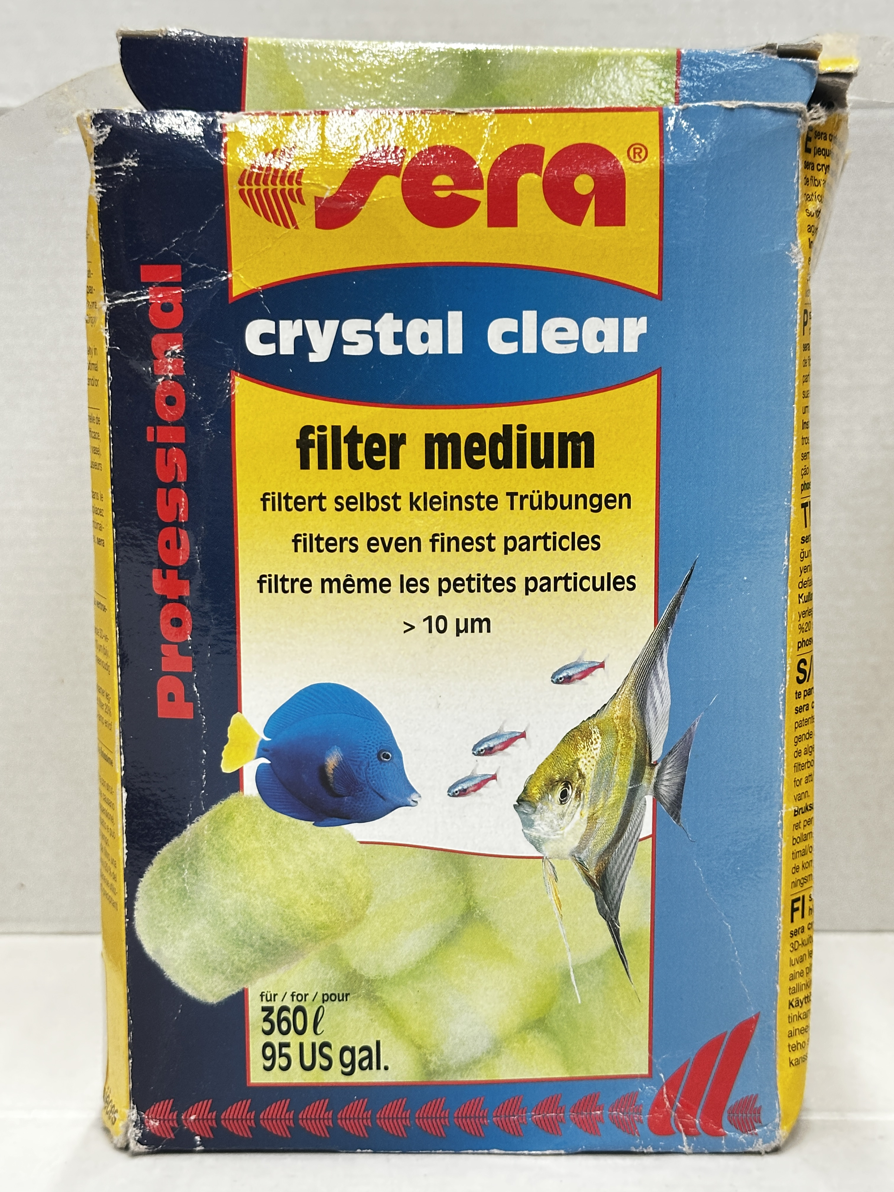 The packaging states it filters particles above 10µm and is suitable for aquariums up to 360 litres / 95 US gallons. Its shape-retaining fibre structure can be washed out several times, making it a useful filter media option for fishkeepers looking to support clear water in freshwater or tropical setups.