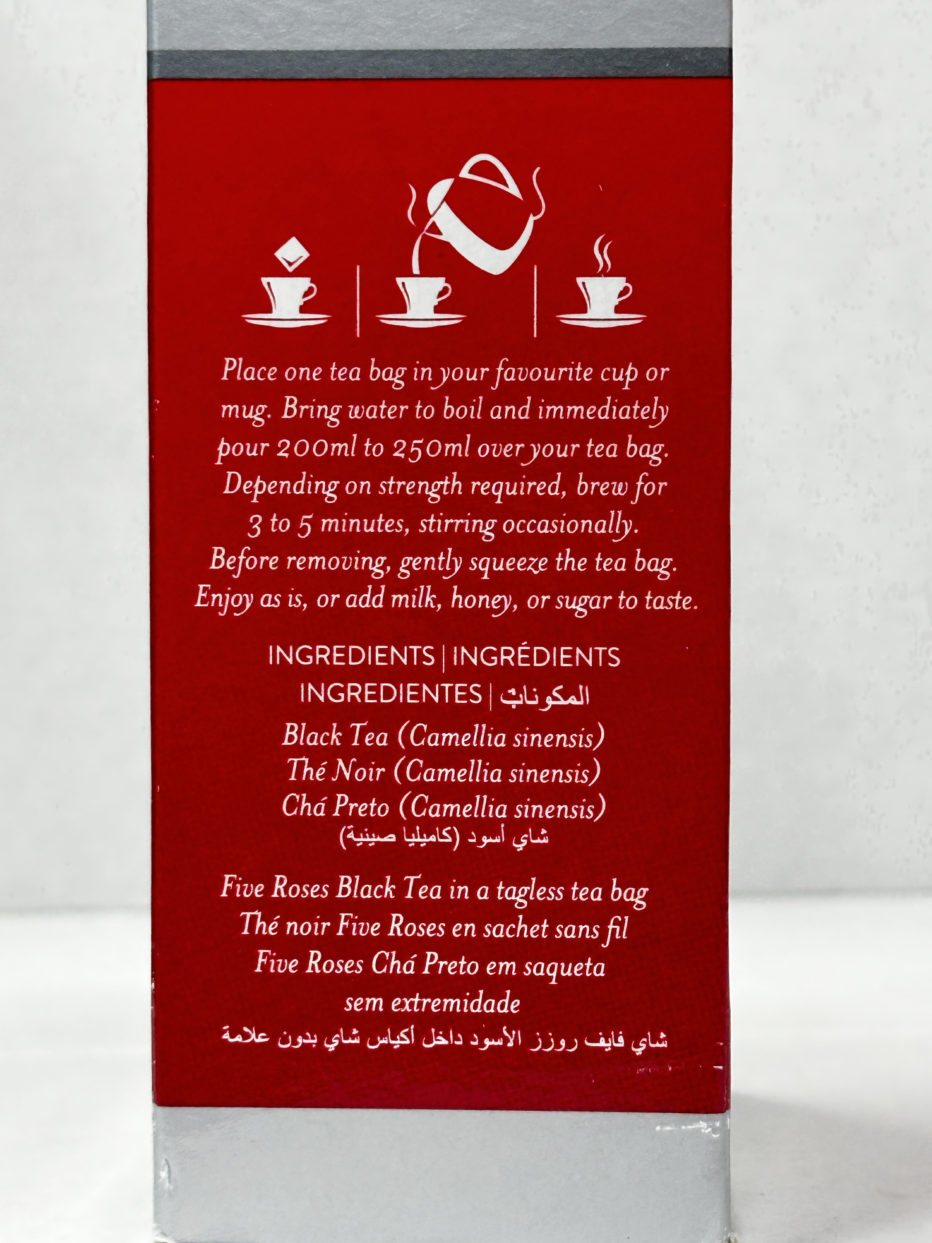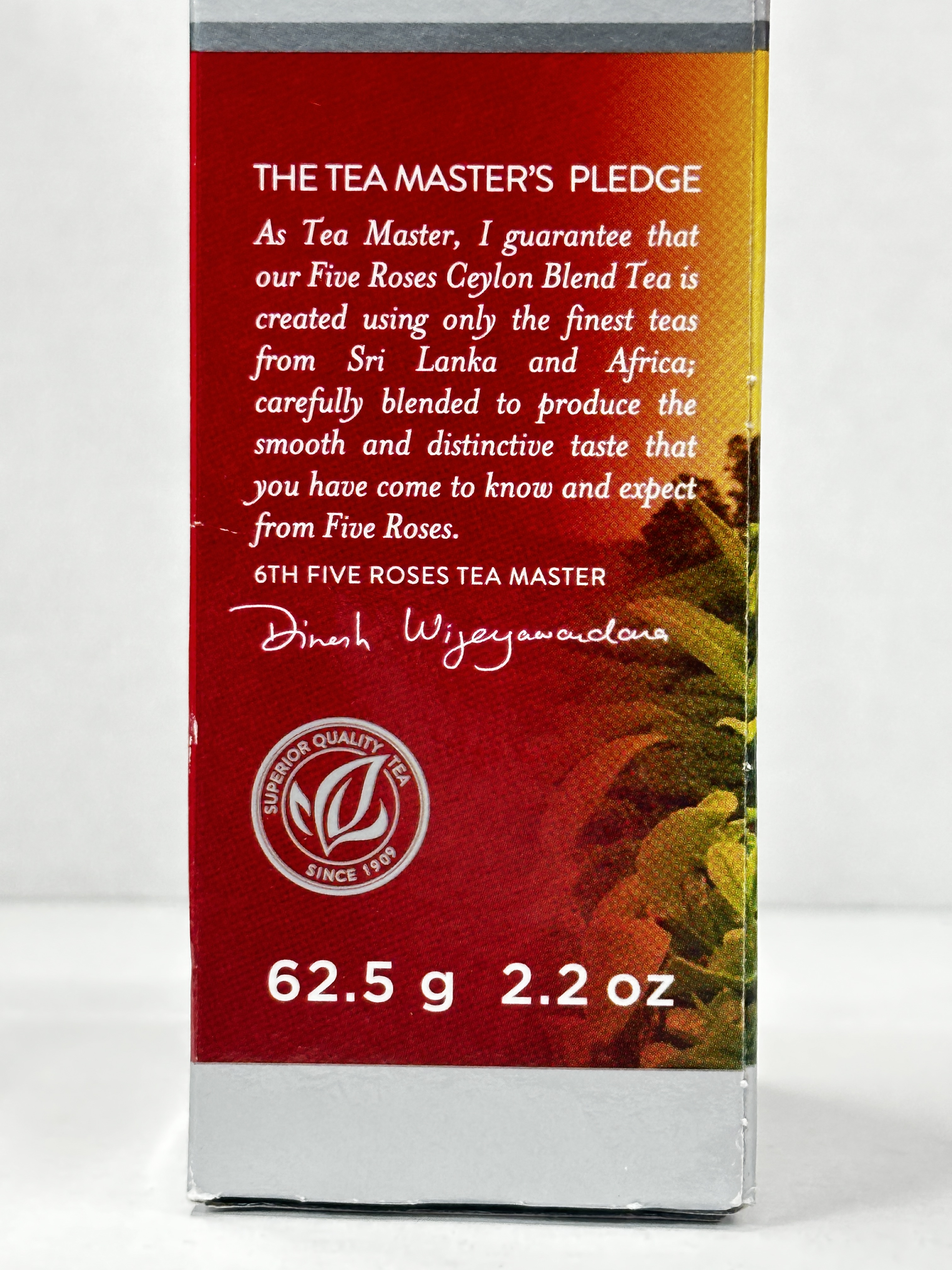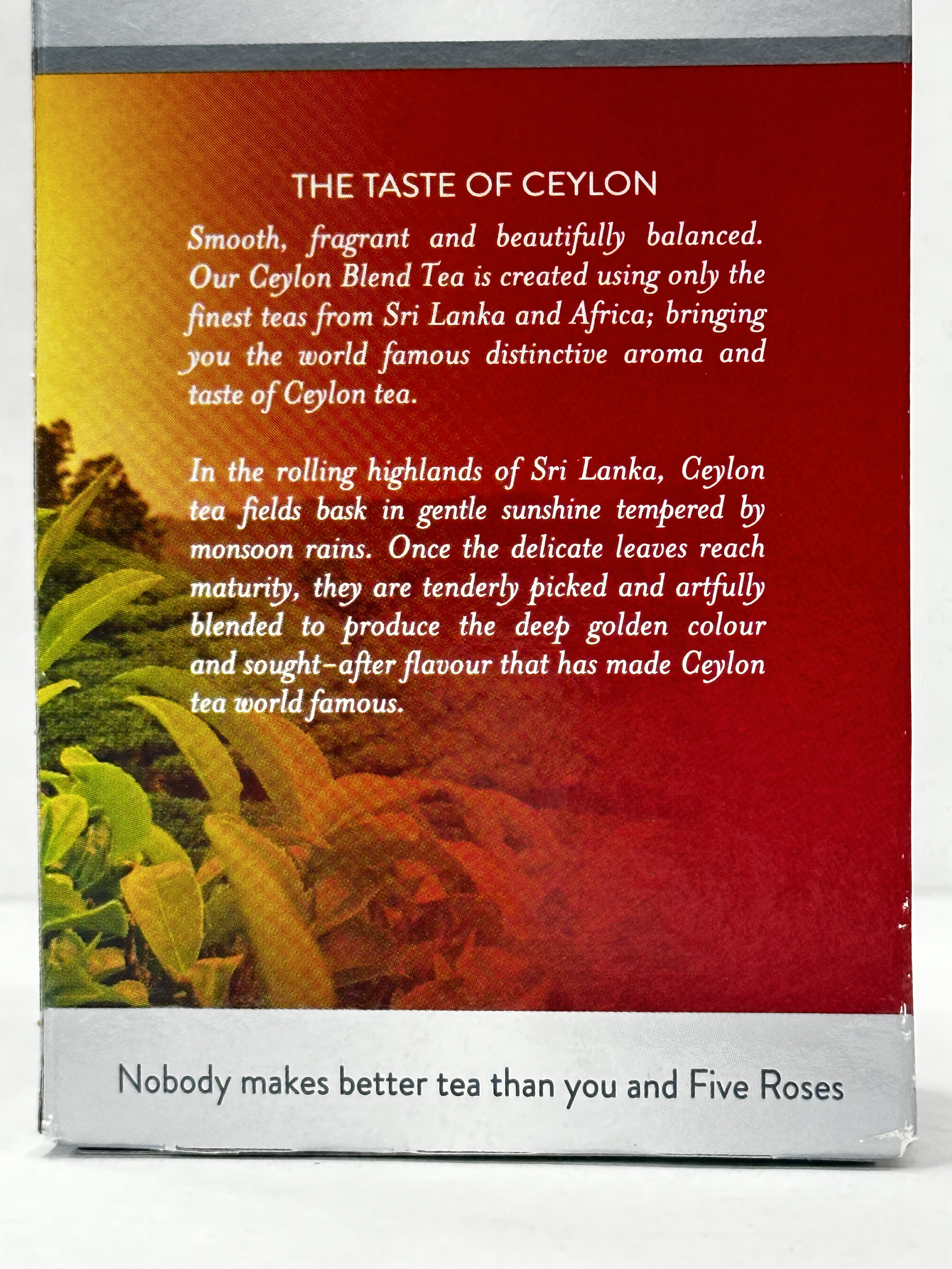 A smooth, fragrant and beautifully balanced Ceylon blend tea made from carefully blended teas from Sri Lanka and Africa. This superior quality black tea is described as rich and aromatic with the distinctive taste and aroma Five Roses is known for. The pack contains 26 tagless tea bags.